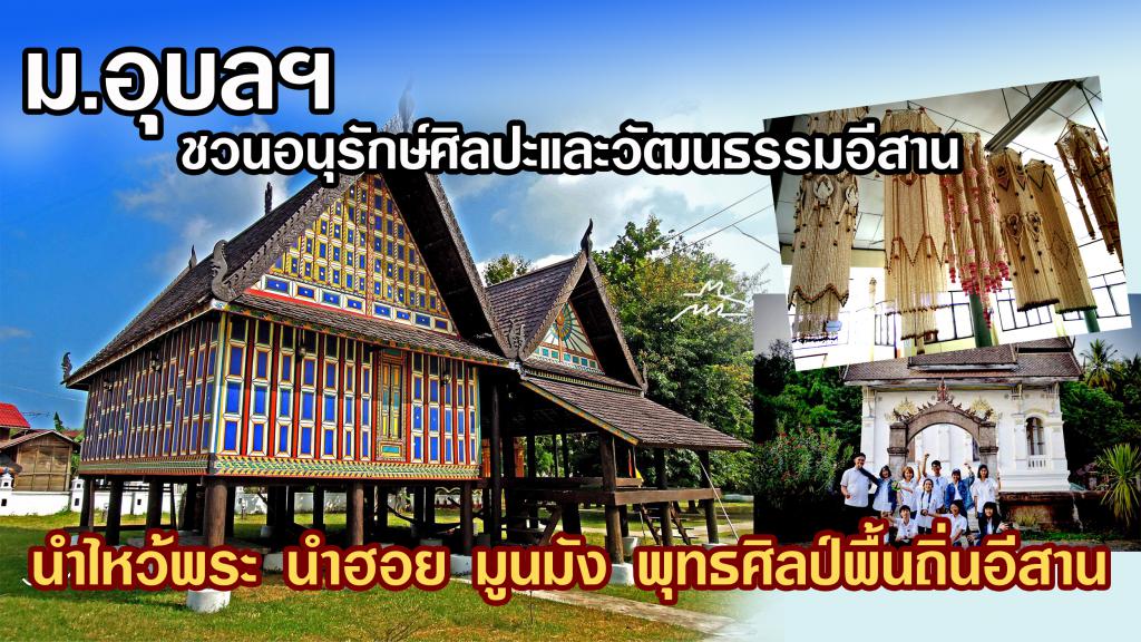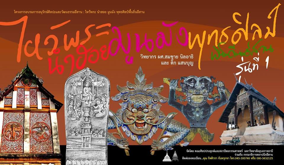 คณะศิลปประยุกต์และสถาปัตยกรรมศาสตร์ มหาวิทยาลัยอุบลราชธานี ขอเชิญผู้สนใจเข้าร่วมโครงการอบรมการอนุรักษ์ศิลปะและวัฒนธรรมอีสาน : ไหว้พระ นำฮอย มูนมัง พุทธศิลป์พื้นถิ่นอีสาน รุ่นที่ 1 ระหว่างวันที่ 2-4 มีนาคม 2561 พร้อมเดินทางศึกษาศิลปะและวัฒนธรรมอีสานในเขตพื้นที่จังหวัดอุบลราชธานี อำนาจเจริญ ยโสธร ร้อยเอ็ด มหาสารคาม กาฬสินธุ์ ผู้สนใจสำรองที่นั่งด่วน รับจำนวนจำกัดเพียง 40 คนเท่านั้น