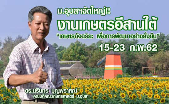 มหาวิทยาลัยอุบลราชธานี โดยคณะเกษตรศาสตร์ เตรียมพร้อมจัดงานใหญ่แห่งปี เกษตรอีสานใต้ ครั้งที่ 12 ภายใต้หัวข้อ “เกษตรอัจฉริยะ เพื่อการพัฒนาอย่างยั่งยืน”สืบสานพระราชปณิธานการเกษตรตามแนวพระราชดำริ พบกับนิทรรศการเกษตรมีชีวิต แปลงสาธิตทางการเกษตร การผลิตพืชและสัตว์ การเสวนาวิชาการ การแสดงนวัตกรรมทางการเกษตร จำหน่ายเครื่องมือ อุปกรณ์และจักรกลทางการเกษตร สินค้าชุมชน ประกวดแข่งขันทักษะทางการเกษตร การแสดงศิลปวัฒนธรรม กำหนดจัดงานระหว่างวันที่ 15-23 กุมภาพันธ์ 2562