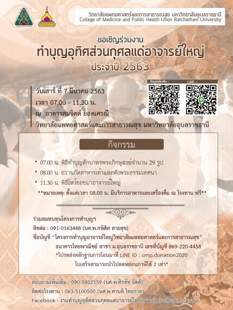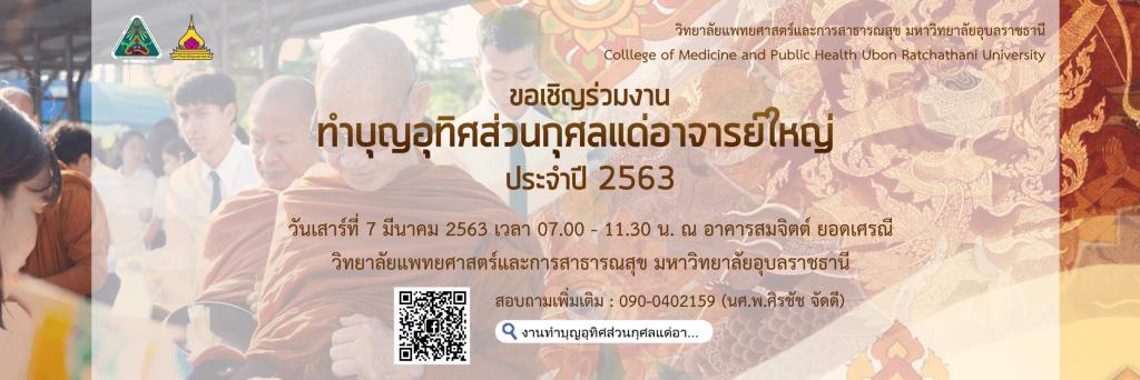วิทยาลัยแพทยศาสตร์และการสาธารณสุข มหาวิทยาลัยอุบลราชธานี ขอเชิญท่านผู้มีจิตศรัทธาร่วมสมทบทุนโครงการ "งานทำบุญอุทิศส่วนกุศลแด่อาจารย์ใหญ่และทำบุญโรงทาน" ประจำปี 2563
