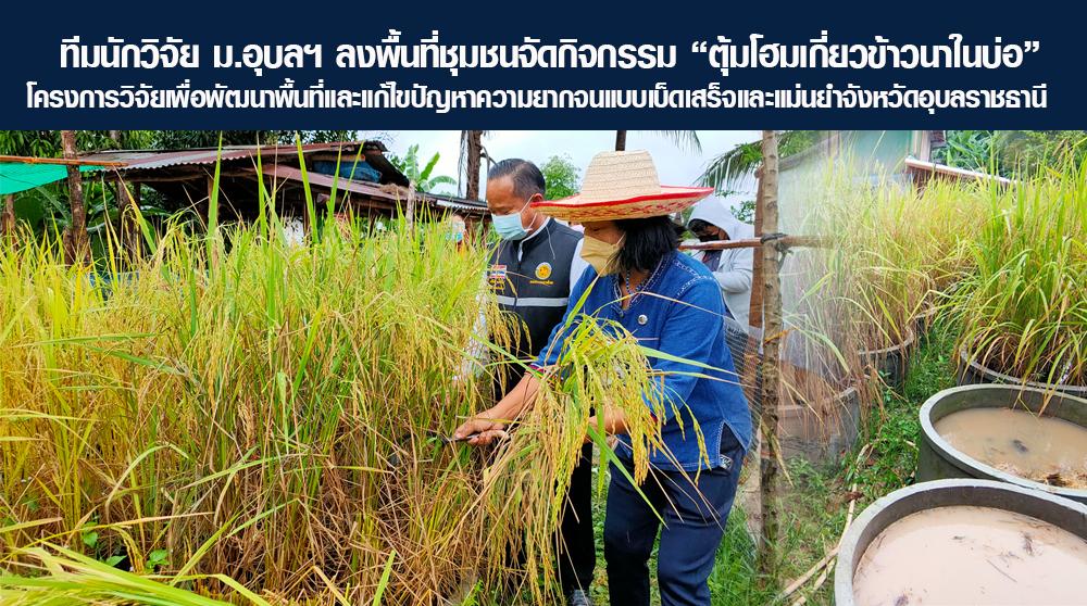 ทีมนักวิจัย มหาวิทยาลัยอุบลราชธานี ลงพื้นที่ชุมชนติดตามผลการดำเนินโครงการวิจัยเพื่อพัฒนาพื้นที่ และแก้ไขปัญหาความยากจนแบบเบ็ดเสร็จและแม่นยำ จังหวัดอุบลราชธานี โดยมี ผู้ช่วยศาสตราจารย์ ดร.จันทรา ธนะวัฒนาวงศ์ รองคณบดีฝ่ายวิจัยและพัฒนานักศึกษา คณะรัฐศาสตร์ เป็นผู้บริหารโครงการฯ ดำเนินการเพื่อค้นหาสอบทาน และสำรวจข้อมูลครัวเรือนยากจน ตลอดจนการพัฒนาและออกแบบนวัตกรรมเพื่อแก้ไขปัญหาความยากจนที่สอดคล้องกับบริบท รวมถึงจัดทำข้อเสนอเชิงนโยบายการแก้ปัญหาความยากจนแบบเบ็ดเสร็จและแม่นยำต่อไป ทั้งนี้โครงการวิจัยฯ ได้จัดกิจกรรม “ตุ้มโฮมเกี่ยวข้าวนาบ่อ” และการเสวนาเรื่อง “นาบ่อ : ปฏิบัติการสร้างความมั่นคงทางด้านอาหารและการแก้จนของคนนาดี” โดยมี นายรัฐพงศ์ รุ่งธนศักดิ์ นายอำเภอดอนมดแดง พร้อมด้วยตัวแทนส่วนราชการและหัวหน้าชุมชน ร่วมเสวนา และเยี่ยมชมพร้อมเกี่ยวข้าวนาในบ่อในแปลง นายสมาน มูลคำ ณ บ้านนาดี ตำบลท่าเมือง อำเภอดอนมดแดง จังหวัดอุบลราชธานี เมื่อวันที่ 2 พฤษภาคม 2565 ที่ผ่านมา