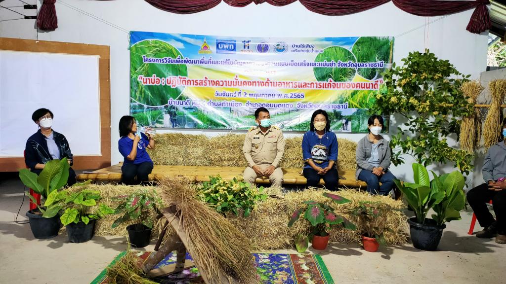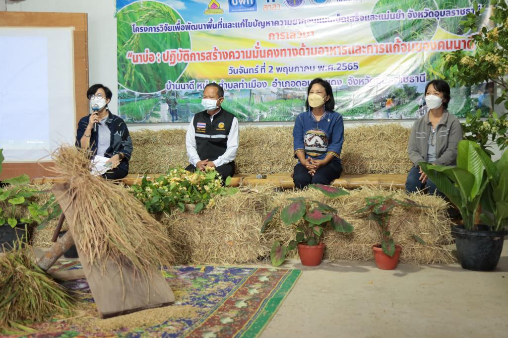 ในส่วนของกิจกรรม “ตุ้มโฮมเกี่ยวข้าวนาบ่อ” และการเสวนา “นาบ่อ : ปฏิบัติการสร้างความมั่นคงทางอาหารและการแก้จนของคนนาดี” ซึ่งเป็นการระดมความคิดเห็น ศึกษาสภาพปัญหา และความต้องการของชุมชนทุกภาคส่วน เพื่อร่วมกันออกแบบนวัตกรรม “นาดี นาในบ่อเพื่อความมั่นคงทางอาหาร” ในการแก้ไขปัญหาความยากจนในจังหวัดอุบลราชธานี สามารถนำไปสู่การเป็นต้นแบบการแก้ไขปัญหาความยากจนแบบเบ็ดเสร็จและแม่นยำต่อไป