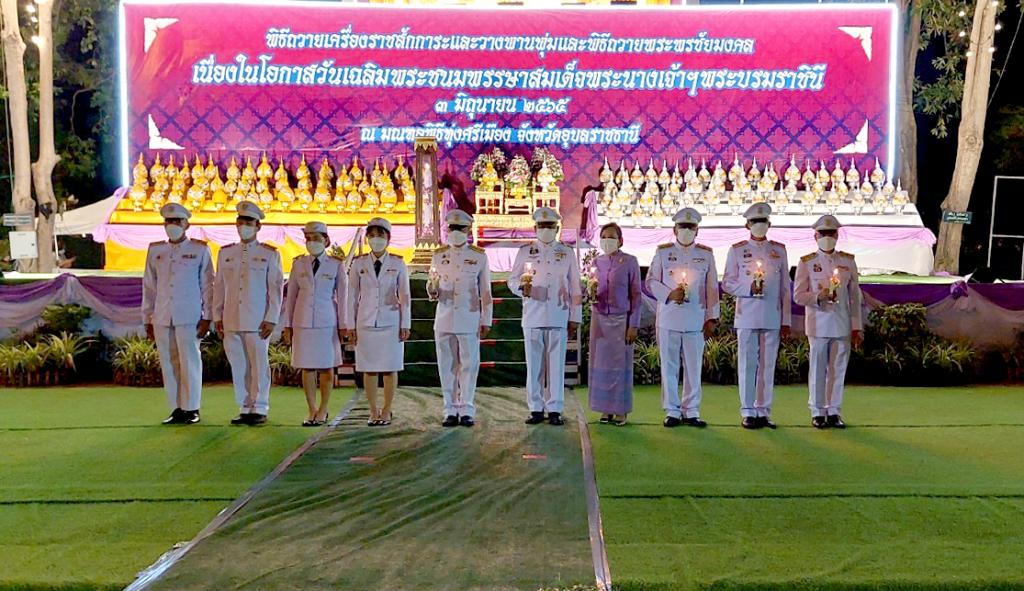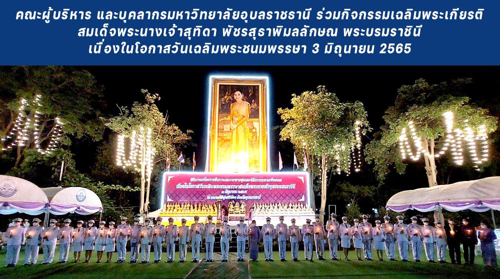 เมื่อวันศุกร์ที่ 3 มิถุนายน 2565 คณะผู้บริหาร และบุคลากรมหาวิทยาลัยอุบลราชธานี ร่วมกิจกรรมเฉลิมพระเกียรติสมเด็จพระนางเจ้าสุทิดา พัชรสุธาพิมลลักษณ พระบรมราชินี เนื่องในโอกาสวันเฉลิมพระชนมพรรษา 3 มิถุนายน 2565 จังหวัดอุบลราชธานี โดยมี นายนภดล พัฒนะศิษอุบลผู้ช่วยอธิการบดีฝ่ายคลังและทรัพย์สิน พร้อมคณะผู้บริหารและบุคลากร ร่วมพิธีทำบุญตักบาตรถวายพระราชกุศล พระสงฆ์สามเณร จำนวน 145 รูป และ ผู้ช่วยศาสตราจารย์ ดร.ชุตินันท์ ประสิทธิ์ภูริปรีชา อธิการบดีมหาวิทยาลัยอุบลราชธานี พร้อมคณะผู้บริหาร และบุคลากรมหาวิทยาลัยอุบลราชธานี ร่วมพิธีถถวายเครื่องราชสักการะและวางพานพุ่ม และร่วมพิธีจุดเทียนถวายพระพรชัยมงคล เนื่องในวโรกาสมหามงคลวันเฉลิมพระชนมพรรษา สมเด็จพระนางเจ้าสุทิดา พัชรสุธาพิมลลักษณ พระบรมราชินี ซึ่งได้เวียนมาบรรจบครบรอบในวันศุกร์ที่ 3 มิถุนายน 2565 ที่จะถึงนี้ และจะทรงมีพระชนมายุครบ 43 พรรษา เพื่อเป็นการเทิดพระเกียรติ และแสดงถึงความจงรักภักดีต่อสถาบันพระมหากษัตริย์และสมเด็จพระนางเจ้าสุทิดา พัชรสุธาพิมลลักษณ พระบรมราชินี โดยพร้อมเพรียงกัน ณ มณฑลพิธีทุ่งศรีเมือง ตำบลในเมือง อำเภอเมืองอุบลราชธานี จังหวัดอุบลราชธานี