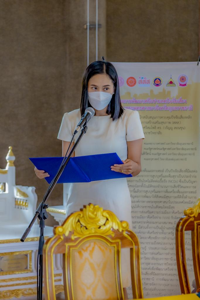 ผู้ช่วยศาสตราจารย์สิริทรัพย์ สีหะวงษ์ คณะพยาบาลศาสตร์ มหาวิทยาลัยอุบลราชธานี หัวหน้าโครงการฯ ในพื้นที่ภาคตะวันออกเฉียงเหนือ กล่าวว่า โครงการพัฒนาเครือข่ายลดปัจจัยเสี่ยงตามแนวพระพุทธศาสนา ได้รับการสนับสนุนโดย สำนักงานกองทุนสนับสนุนการสร้างเสริมสุขภาพ (สสส) มีวัตถุประสงค์เพื่อรวบรวมฐานข้อมูลวัดต้นแบบทั่วประเทศ โดยในพื้นที่จังหวัดอุบลราชธานี คณาจารย์จากคณะพยาบาลศาสตร์และคณะรัฐศาสตร์ มหาวิทยาลัยอุบลราชธานี วิทยาลัยสงฆ์อุบลราชธานี มหาวิทยาลัยมหาจุฬาลงกรณราชวิทยาลัย และสำนักงานพระพุทธศาสนาจังหวัดอุบลราชธานี ภายใต้ความเมตตาอนุเคราะห์จากพระครูโกศลวิหารคุณ รองเจ้าคณะอำเภอเมืองอุบลราชธานี ได้ดำเนินงานเพื่อพัฒนาเครือข่ายวัดต้นแบบในการส่งเสริมการควบคุมปัจจัยเสี่ยงที่มีผลกระทบต่อสุขภาวะของประชาชน ผ่าน 3 กิจกรรมหลักคือ 1) พิธีเปิดโครงการ การมอบป้ายวัดต้นแบบ 2) การลงพื้นที่โดยคณะนักวิจัย ณ วัดต้นแบบ 20 แห่ง และ 3) พิธีลงนามบันทึกข้อตกลงความร่วมมือเครือข่ายวัดต้นแบบลดปัจจัยเสี่ยงจังหวัดอุบลราชธานี
