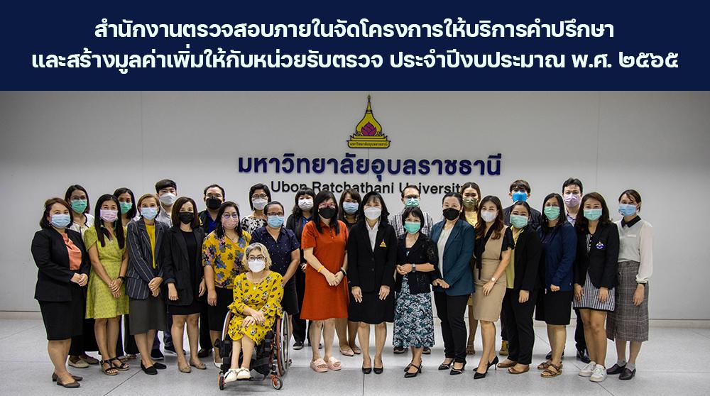 มหาวิทยาลัยอุบลราชธานี โดย สำนักงานตรวจสอบภายใน จัดโครงการให้บริการคำปรึกษาและสร้างมูลค่าเพิ่มให้กับหน่วยรับตรวจ ประจำปีงบประมาณ 2565 เพื่อให้ความรู้ความเข้าใจในการปฏิบัติงานให้เป็นไปตามกฎระเบียบของทางราชการที่เกี่ยวข้อง และระบบควบคุมภายในด้านการจ่ายเงินที่ดีได้อย่างถูกต้อง สามารถนำความรู้ความเข้าใจที่ได้รับไปปรับใช้หรือประยุกต์ใช้ในการปฏิบัติงานได้ โดยมี ผู้ช่วยศาสตราจารย์ชุตินันท์ ประสิทธิ์ภูริปรีชา อธิการบดี เป็นประธานในพิธี ซึ่งมี ผู้บริหาร บุคลากร และผู้ปฏิบัติงานที่เกี่ยวข้องกับการจัดโครงการวิจัย โครงการบริการวิชาการ โครงการทำนุบำรุงศิลปวัฒนธรรม และโครงการที่ได้รับสนับสนุนงบประมาณจากหน่วยงานภายนอก เข้าร่วมโครงการจำนวน 26 คน ณ ห้องประชุมพิบูลมังสาหาร สำนักงานอธิการบดี 2 เมื่อวันที่ 19 กันยายน 2565 ที่ผ่านมา