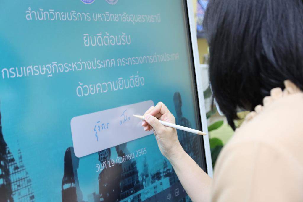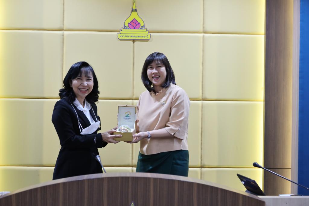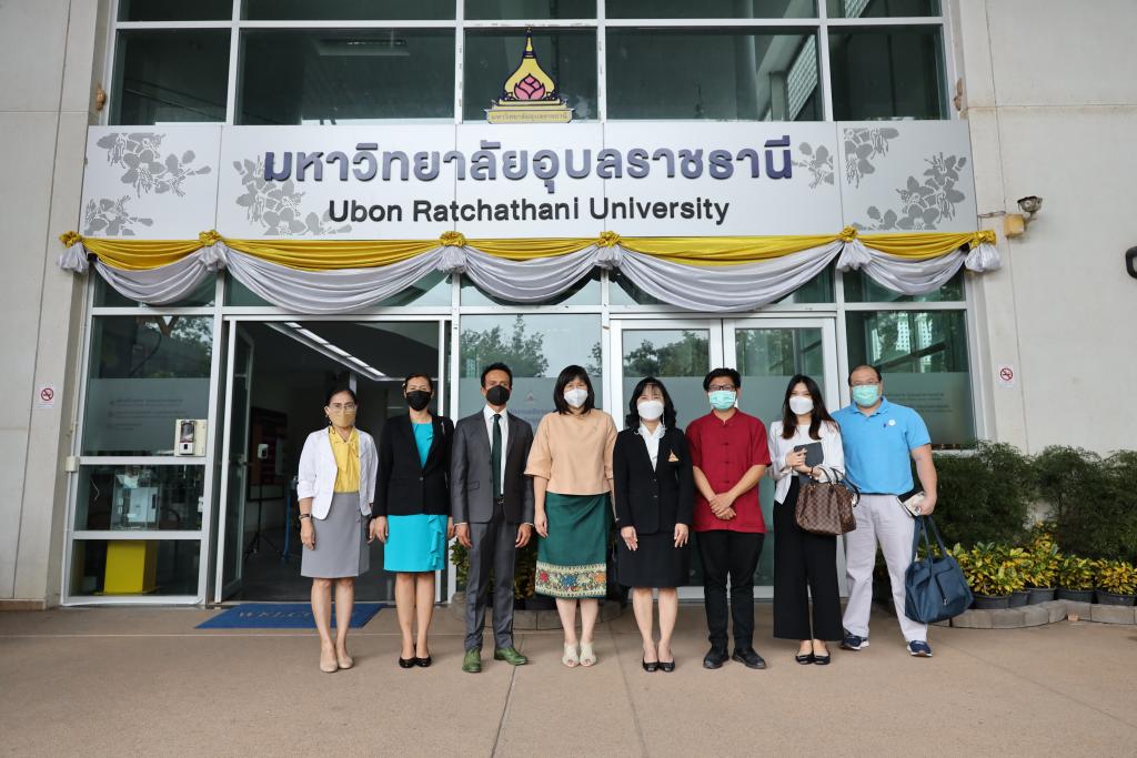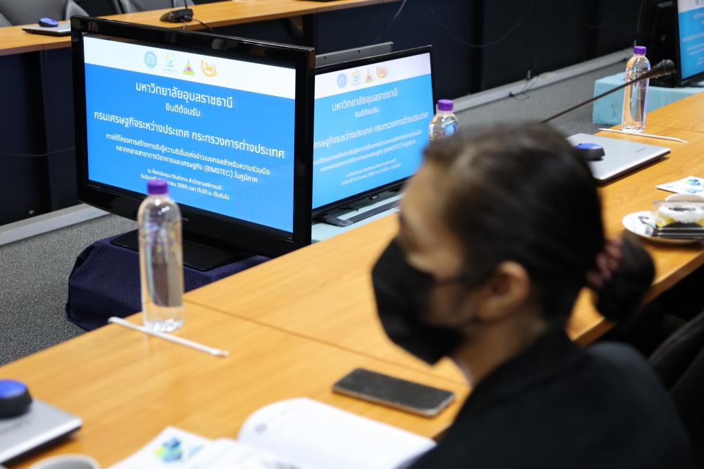 ผศ.ดร.ชุตินันท์ ประสิทธิ์ภูริปรีชา อธิการบดีมหาวิทยาลัยอุบลราชธานี พร้อมคณะผู้บริหาร ให้การต้อนรับ นางสาวรุจิกร แสงจันทร์ รองอธิบดีกรมเศรษฐกิจระหว่างประเทศ กระทรวงการต่างประเทศ และคณะ ในโอกาสเยี่ยมเยือนและหารือความร่วมมือภายใต้โครงการ สร้างการรับรู้ความริเริ่มแห่งอ่าวเบงกอลสำหรับความร่วมมือ หลากหลายสาขาทางวิชาการและเศรษฐกิจ (BIMSTEC) ในภูมิภาค เมื่อวันจันทร์ที่ 19 กันยายน 2565 ณ ห้องประชุมวารินชำราบ สำนักงานอธิการบดี มหาวิทยาลัยอุบลราชธานี