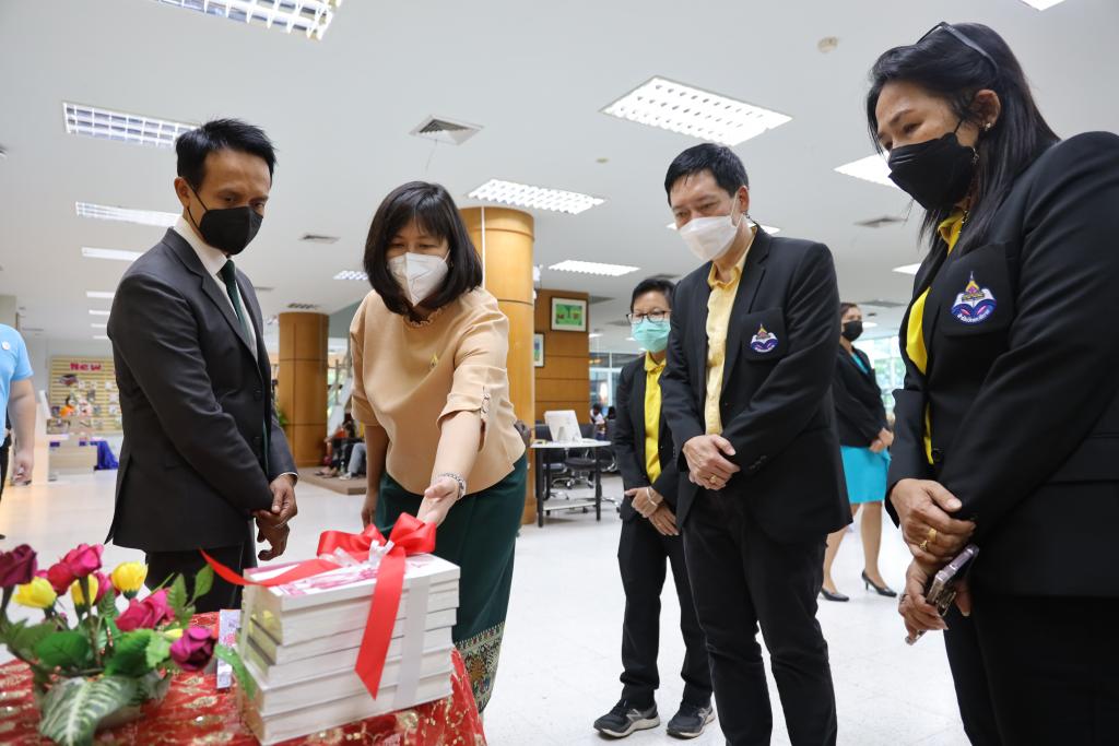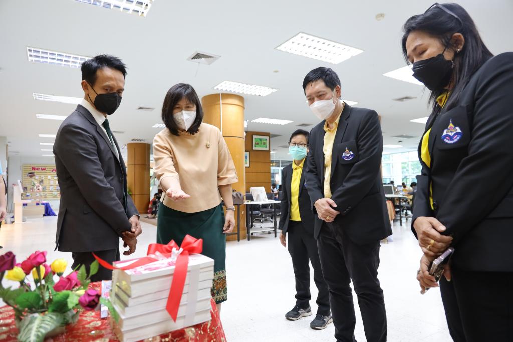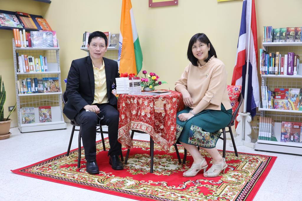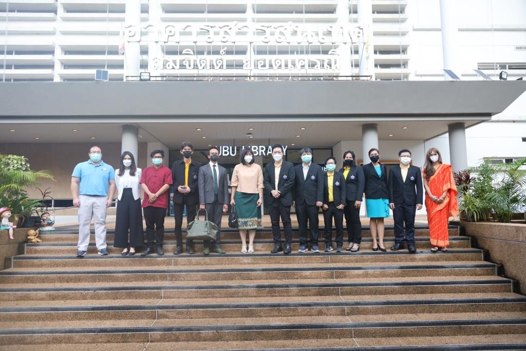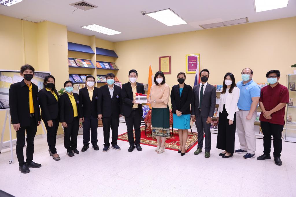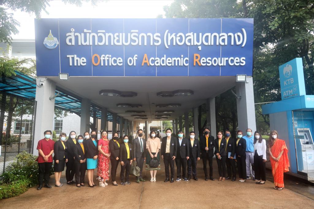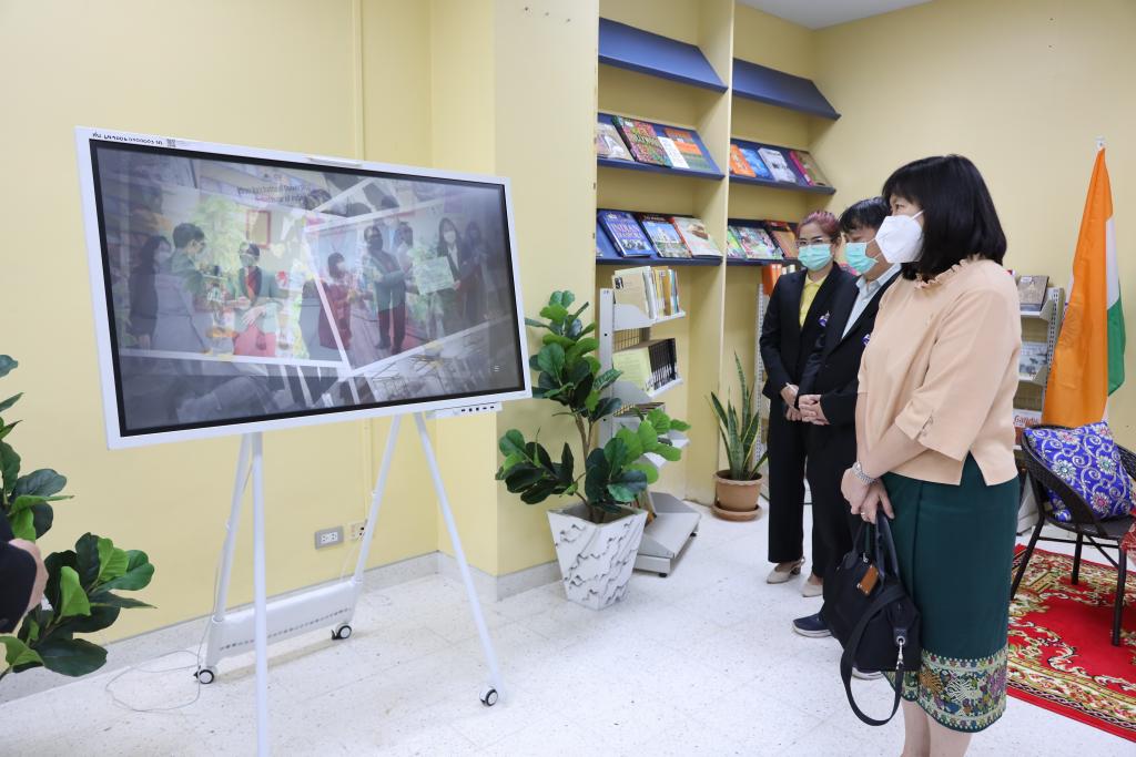 จากนั้นนางสาวรุจิกร แสงจันทร์ รองอธิบดีกรมเศรษฐกิจระหว่างประเทศ กระทรวงการต่างประเทศ และคณะได้เดินทางเยือนสำนักวิทยบริการ เพื่อมอบหนังสือและทรัพยากรการเรียนรู้ด้านการต่างประเทศของไทยให้กับ ดร.ภาคภูมิ สืบนุการณ์ ผู้อำนวยการสำนักวิทยบริการ พร้อมเยี่ยมชมหอสมุดและมุมอินเดียด้วย