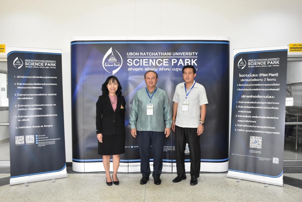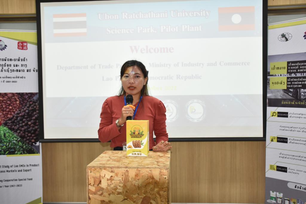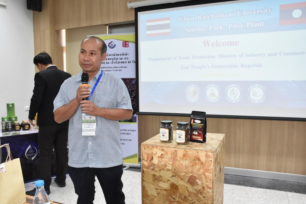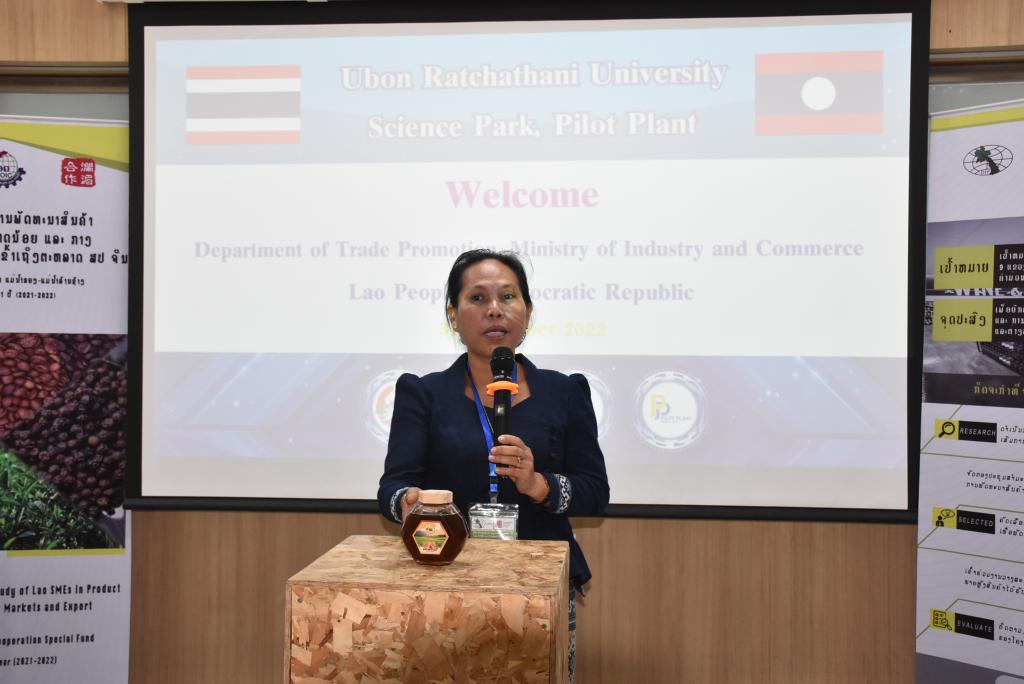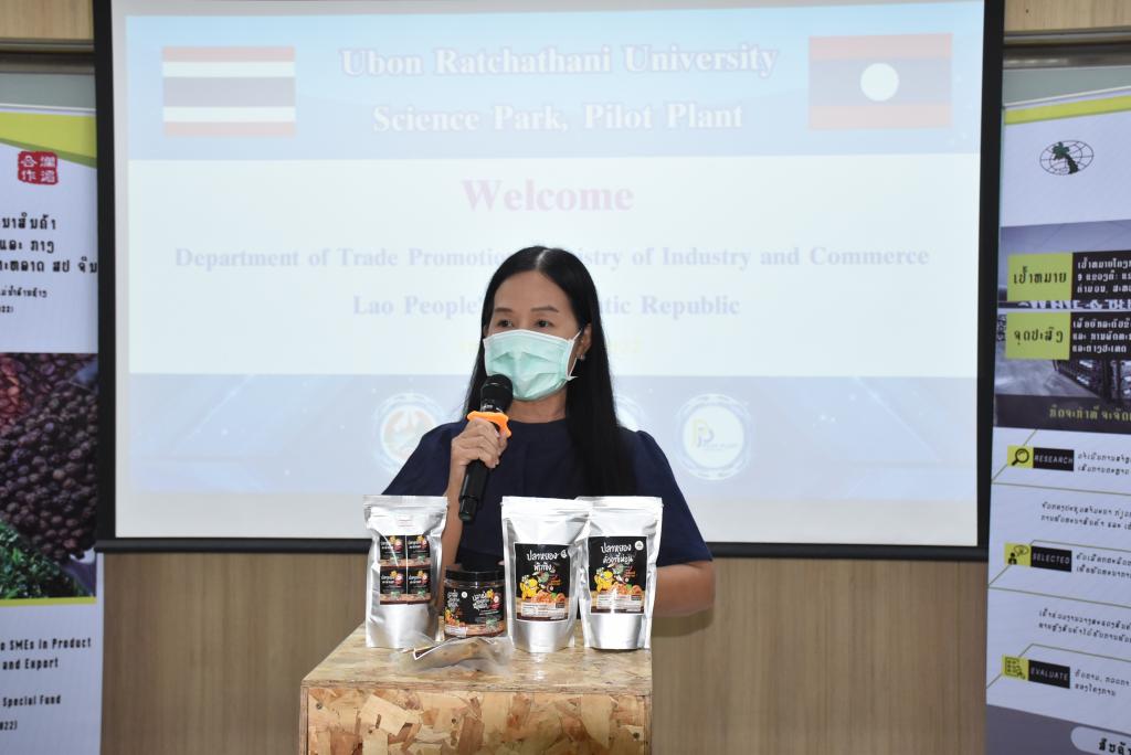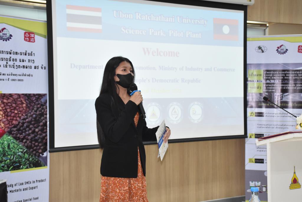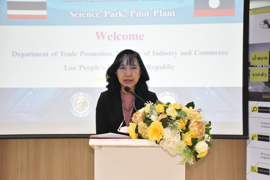 ผู้ช่วยศาสตราจารย์ ดร.ชุตินันท์ ประสิทธิ์ภูริปรีชา อธิการบดีมหาวิทยาลัยอุบลราชธานี กล่าวว่า มหาวิทยาลัยอุบลราชธานีมีความยินดีและเป็นเกียรติอย่างยิ่ง ที่มีโอกาสต้อนรับคณะผู้บริหารและผู้ประกอบการจากสาธารณรัฐประชาธิปไตยประชาชนลาว ที่เดินทางมาร่วมกิจกรรมศึกษาดูงานและการจัดคู่ธุรกิจวันนี้ สืบเนื่องจากมหาวิทยาลัยอุบลราชธานี เป็นมหาวิทยาลัยที่มุ่งเน้นการเรียนการสอน และการวิจัย ด้วยวิทยาศาสตร์ เทคโนโลยี และนวัตกรรม เพื่อยกระดับการพัฒนาเศรษฐกิจและสังคมในพื้นที่ รวมถึงการผลักดันการนำองค์ความรู้ที่เกิดขึ้นภายในมหาวิทยาลัยออกสู่สังคมและชุมชน ทั้งระดับจังหวัด และระดับประเทศ โดยมีอุทยานวิทยาศาสตร์และโรงงานต้นแบบ เป็นหน่วยงานที่มีความสำคัญในการขับเคลื่อนโดยมุ่งเน้นการเชื่อมโยงการถ่ายทอดองค์ความรู้ของนักวิจัย คณาจารย์ และบุคลากรของมหาวิทยาลัย เพื่อยกระดับผู้ประกอบการให้เป็นผู้ประกอบการนวัตกรรม ซึ่งในส่วนของโรงงานต้นแบบนั้น ประกอบด้วยโรงงาน 2 โรงงาน ได้แก่ โรงงานต้นแบบด้านการผลิตอาหารประเภทเนื้อสัตว์ และโรงงานต้นแบบด้านการผลิตอาหารประเภทผักและผลไม้ โดยสร้างขึ้นมาเพื่อเป็นสถานที่ให้บริการสำหรับเกษตรกรและผู้ประกอบการในพื้นที่อีสานและกลุ่มประเทศเพื่อนบ้าน เพื่อใช้ในการผลิต วิจัย และพัฒนาผลิตภัณฑ์ตลอดจนบรรจุภัณฑ์ โดยมีวัตถุประสงค์หลักในการเพิ่มมูลค่าผลผลิตทางการเกษตรและยกระดับความสามารถในการผลิตสินค้าของเกษตรกรและผู้ประกอบการในพื้นที่ ทั้งในแง่ของคุณภาพ มาตรฐาน ปริมาณการผลิต และการสร้างมูลค่าเพิ่มของผลิตภัณฑ์ เพื่อช่วยลดต้นทุนด้านการจัดหาเครื่องจักร การจัดการเครื่องจักร การซ่อมบำรุง การสร้างและรักษามาตรฐานการผลิต อันจะเป็นการสร้างงานให้แก่เกษตรกรและผู้ประกอบการ เป็นไปตามวิสัยทัศน์ของมหาวิทยาลัยต่อไป