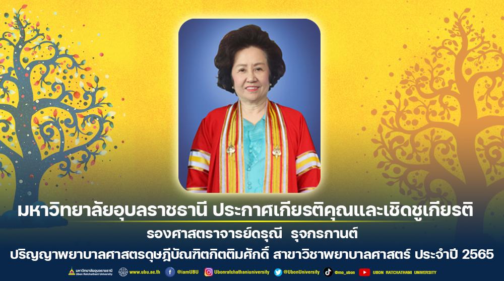 มหาวิทยาลัยอุบลราชธานี มีความยินดีประกาศเกียรติคุณเพื่อเชิดชูเกียรติ รองศาสตราจารย์ดรุณี รุจกรกานต์ ที่ได้รับปริญญาพยาบาลศาสตรดุษฎีบัณฑิตกิตติมศักดิ์ สาขาพยาบาลศาสตร์ โดย สภามหาวิทยาลัยอุบลราชธานีได้พิจารณาอนุมัติปริญญากิตติมศักดิ์ ประจำปี 2565 แก่บุคคลผู้มีผลงานทางวิชาการดีเด่นในสาขาที่มีการสอนในมหาวิทยาลัย ทำคุณประโยชน์อย่างยิ่งแก่มหาวิทยาลัยหรือประเทศชาติหรือนานาชาติ สมควรได้รับการยกย่องเป็นแบบอย่างให้ผู้อื่นเจริญรอยตาม ผลงานสามารถนำไปใช้ประโยชน์อย่างกว้างขวางอันส่งผลดีต่อการพัฒนาองค์ความรู้ขององค์กร สังคมประเทศชาติหรือนานาชาติ โดยจะเข้ารับพระราชทานปริญญาดุษฎีบัณฑิตกิตติมศักดิ์ ประจำปี 2565 ในวันพฤหัสบดีที่ 22 ธันวาคม พ.ศ. 2565 ณ อาคารเฉลิมพระเกียรติ 7 รอบ พระชนมพรรษา มหาวิทยาลัยอุบลราชธานี