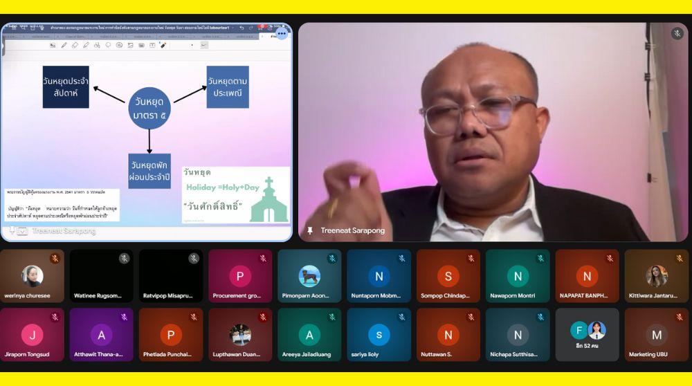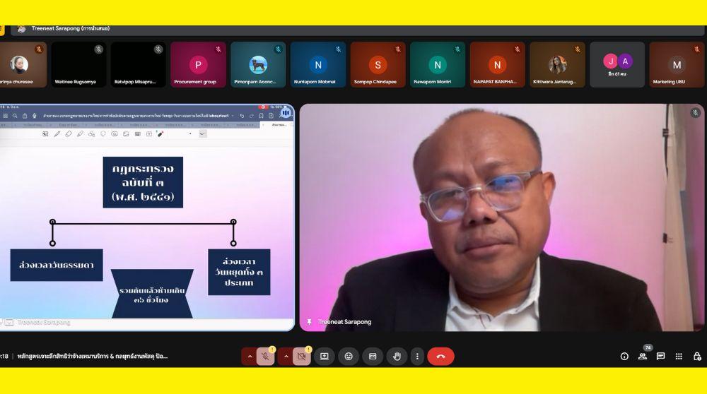 มหาวิทยาลัยอุบลราชธานี: ศูนย์นวัตกรรมบริการวิชาการ (InCAS UBU) ได้จัดกิจกรรมอบรมออนไลน์ครั้งสำคัญ เพื่อเสริมสร้างความรู้ความเข้าใจด้านกฎหมายแก่บุคลากรภาครัฐ ในหัวข้อ “เจาะลึกสิทธิจ้างเหมาบริการ และกลยุทธ์งานพัสดุเพื่อป้องกันความเสี่ยงทางกฎหมาย ตามพระราชบัญญัติคุ้มครองแรงงาน (ฉบับที่ 9) พ.ศ. 2568” โดยมี ผู้ช่วยศาสตราจารย์ ดร.ปิยณัฐ สร้อยคำ ให้การต้อนรับ รับเกียรติวิทยากรโดยรองศาสตราจารย์ตรีเนตร สาระพงศ์ จากคณะนิติศาสตร์ ซึ่งมีผู้เข้าร่วมอบรมจากหน่วยงานภาครัฐทั่วประเทศเข้าร่วมออนไลน์จำนวน 60คน เมื่อวันที่ 3ธันวาคม 2568ผ่านระบบ Google Meet