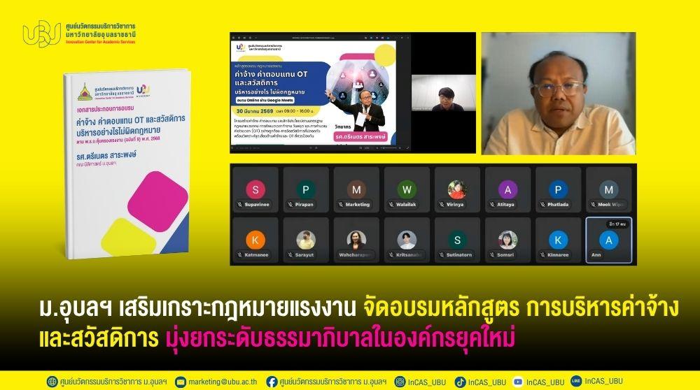 ศูนย์นวัตกรรมบริการวิชาการ มหาวิทยาลัยอุบลราชธานี โดยUBU Academy ตอกย้ำภารกิจการเป็นศูนย์กลางแห่งการเรียนรู้ จัดงานอบรมออนไลน์สุดเข้มข้นในหลักสูตร “ค่าจ้าง ค่าตอบแทน OT และสวัสดิการ บริหารอย่างไรไม่ผิดกฎหมาย” ผ่านระบบ Google Meet รับเกียรติจาก รองศาสตราจารย์ตรีเนตร สาระพงษ์ อาจารย์ผู้ทรงคุณวุฒิ และเจ้าของเพจกฎหมายแรงงานชื่อดัง อีกทั้งยังมีดีกรีเป็นอดีตกรรมาธิการวิสามัญพิจารณาร่าง พ.ร.บ.คุ้มครองแรงงานเป็นวิทยากร พร้อมยกเคสตัวอย่างจริงและจุดผิดพลาดที่นายจ้างมักมองข้าม ทำให้ผู้เข้าร่วมสามารถนำไปปรับใช้ในองค์กรได้ทันทีโดยได้รับความสนใจจากเจ้าของกิจการ ผู้บริหาร และฝ่ายบริหารทรัพยากรมนุษย์ (HR) จากทั่วประเทศ เมื่อวันที่ 30มีนาคม 2569ที่ผ่านมา