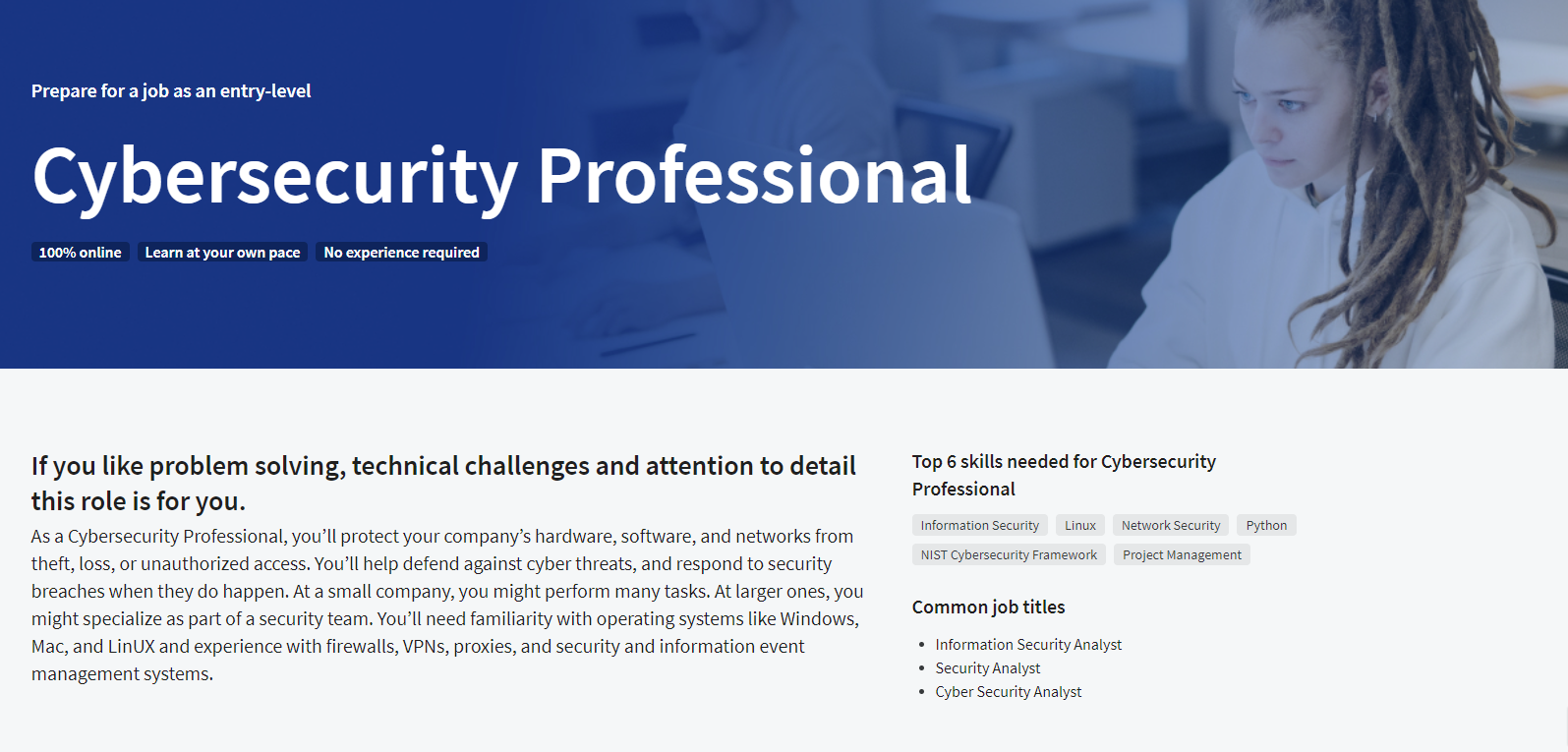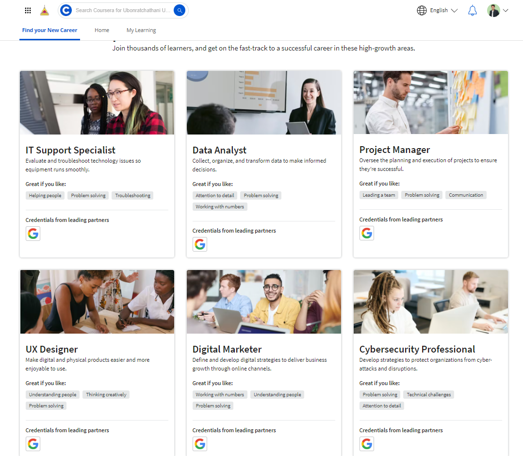 ทั้งนี้คอร์ส Google Cybersecurity ใน Coursera นำเสนอเนื้อหาที่มีคุณภาพและประสิทธิภาพสูง ที่สามารถช่วยให้ผู้เรียนได้รับความรู้และทักษะที่จำเป็นในด้านความมั่นคงปลอดภัยของข้อมูลและเทคโนโลยีทางไซเบอร์อย่างเหมาะสมและเข้าใจง่าย. โดยมหาวิทยาลัยอุบลราชธานี มีเนื้อหาให้บุคลากรและนักศึกษาสามารถเข้าร่วมฝึกอบรมได้ 6 เรื่องซึ่งจะประกอบด้วย 1. IT Support Specialist2. Data Analyst 3. Project Manager 4. UX Designer 5. Digital Marketer 6. Cybersecurity Professional