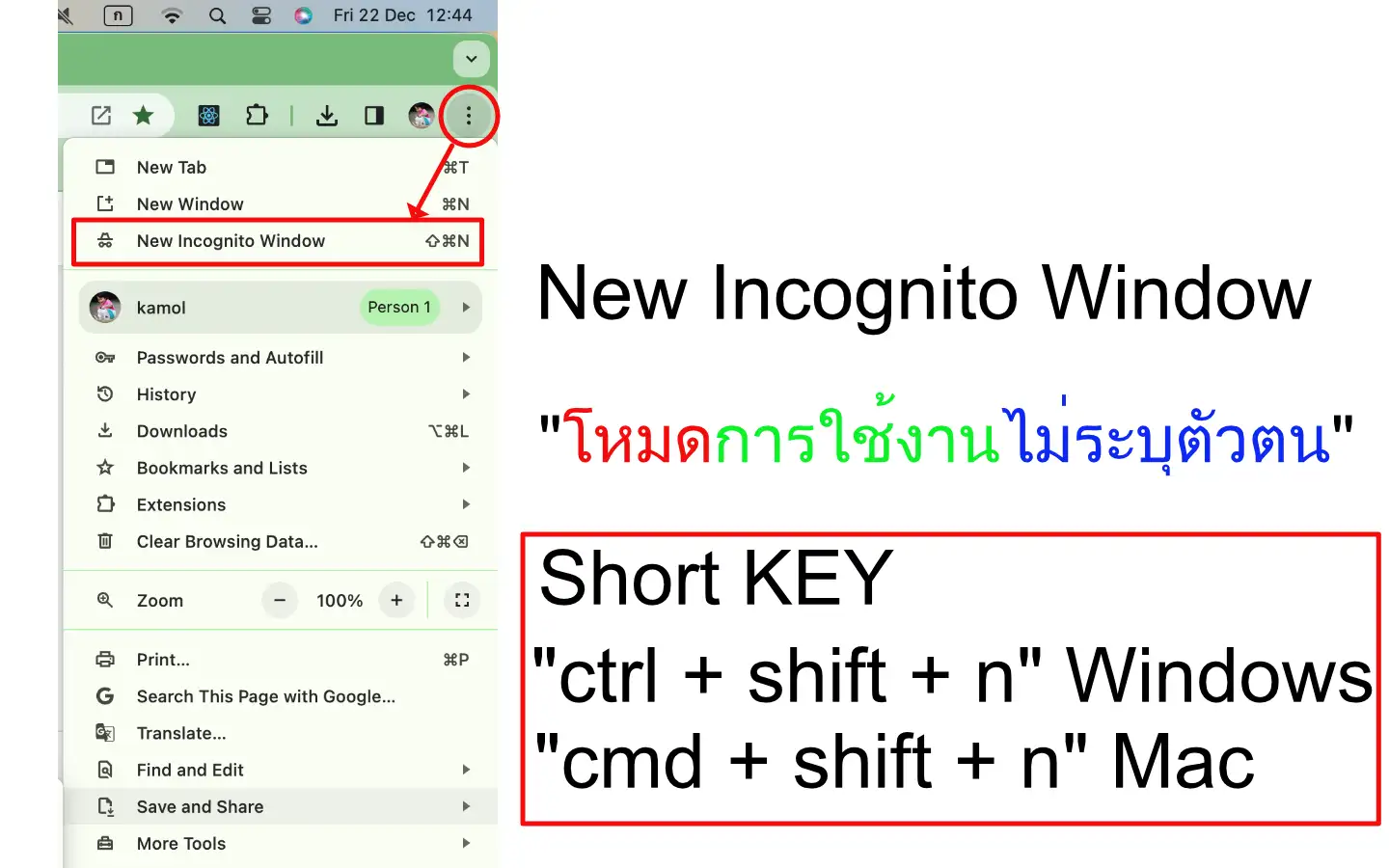 ![]() เมื่อมีเหตุจำเป็นต้องใช้เครื่องสาธารณะอย่าง ห้องประชุมและห้องเรียน หากต้องการใช้ไฟล์จาก Google drive และหรือ Email การใช้ Google Drive และ Google Chrome อย่างไรให้ปลอดภัย 1. ใช้ Google Chrome โหมด “Incognito windows” ไม่ทิ้งร่องรอย โหมด “Incognito Windows” ของ Google Chrome ซึ่งเป็นฟีเจอร์ที่ช่วยให้ผู้ใช้สามารถท่องเว็บไซต์โดยไม่ทิ้งร่องรอยในข้อมูลการเรียกดูหรือการใช้งาน การใช้โหมด “Incognito Windows” ช่วยเพิ่มความปลอดภัยและความเป็นส่วนตัวในการท่องเว็บไซต์ โดยที่ไม่ต้องกังวลว่าข้อมูลการเรียกดูหรือข้อมูลส่วนตัวจะถูกบันทึกไว้ในเว็บบราวเซอร์หรือคอมพิวเตอร์ที่ใช้งาน 2. วิธีการเปิดใช้งานโหมด “Incognito Windows” ของ Google Chrome ทั้ง Windows และ Mac