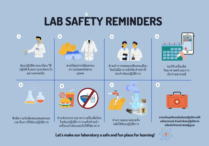 วัตถุประสงค์ · ให้ความรู้เรื่องความปลอดภัยในห้องปฏิบัติการ · อภิบายขั้นตอนการขอใช้ห้องปฏิบัติการ การจองเครื่องมือพื้นฐาน และเครื่องมือวิทยาศาสตร์ · การใช้เครื่องมือที่ถูกต้องเหมาะสม และการบำรุงรักษาเครื่องมือพื้นฐาน · การจัดเก็บสารเคมีอันตราย สาเหตุทำให้เกิดปัญหา 1. นักศึกษายังขาดความตระหนักถึงความปลอดภัยในห้องปฏิบัติการทั้งการใช้สารเคมี อุปกรณ์ เครื่องมือวิทยาศาสตร์ ที่อย่างก่อให้เกิดอันตราย และการจัดการของเสียอันตรายที่เกิดขึ้นจากแลป 2. นักศึกษายังไม่เข้าใจถึงขั้นตอนการการขอใช้ห้องปฏิบัติการ การจองเครื่องมือพื้นฐาน และเครื่องมือวิทยาศาสตร์และผู้รับผิดชอบเครื่องมือ 3. นักศึกษายังขาดความระมัดระวัง และการดูแลรักษาเครื่องมือเบื้องต้นหลังการใช้งาน การแก้ไข / ปรับปรุง 1. จัดการอบรมความปลอดภัย และการจัดการของเสียอันตรายในการใช้ห้องปฏิบัติการเคมี สำหรับนักศึกษา Senior Project 2. สร้างความเข้าใจในการจองใช้เครื่องมือวิทยาศาสตร์และการจัดการของเสียอันตราย แนะนำขั้นตอนตั้งแต่เริ่มโปรเจคจนกระทั่งเสร็จโปรเจค 3. มีการทดสอบความรู้หลังการอบรม และให้เกียรติบัตรรับรองการผ่านการอบรม ผู้จัดทำ นางสาวเสาวนีย์ เหล่าสิงห์ และคณะนักวิทยาศาสตร์ ภาควิชาเคมี ไฟล์แนบ : ความปลอดภัย และการจัดการของเสียอันตรายในการใช้ห้องปฏิบัติการเคมี สำหรับนักศึกษา Senior Project |