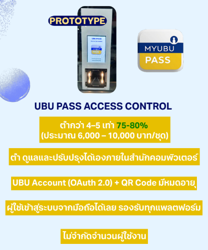 สรุป ระบบควบคุมประตูและการเข้า–ออกอัจฉริยะ (UBU PASS ACCESS CONTROL)ช่วยเพิ่มความปลอดภัยและความสะดวกในการใช้งานพื้นที่เฉพาะ ลดขั้นตอนการอนุมัติสิทธิ์ ลดเวลาการเข้า–ออก ลดต้นทุนจากการบำรุงรักษาระบบและการพัฒนาแอปเฉพาะ และสามารถติดตามตรวจสอบการใช้งานย้อนหลังได้ ระบบนี้มีความยืดหยุ่นต่อการขยายไปยังพื้นที่อื่น ๆ ของมหาวิทยาลัย และรองรับการพัฒนาเพิ่มเติมในอนาคต เช่น การตรวจสอบตำแหน่ง GPSหรือการเชื่อมต่อกับระบบอื่น ๆ |