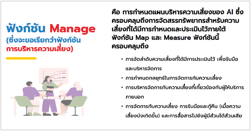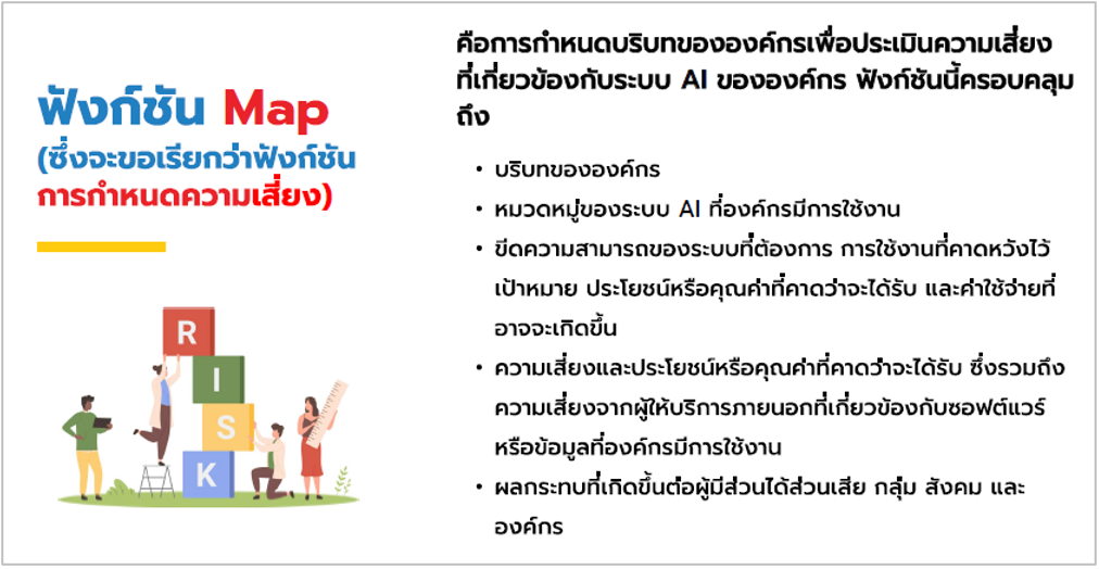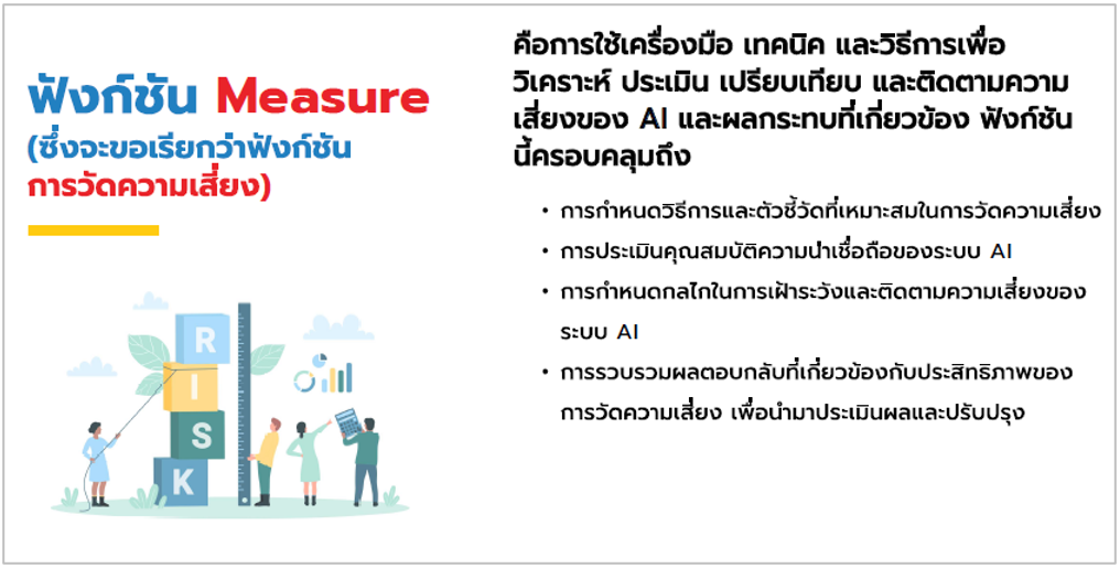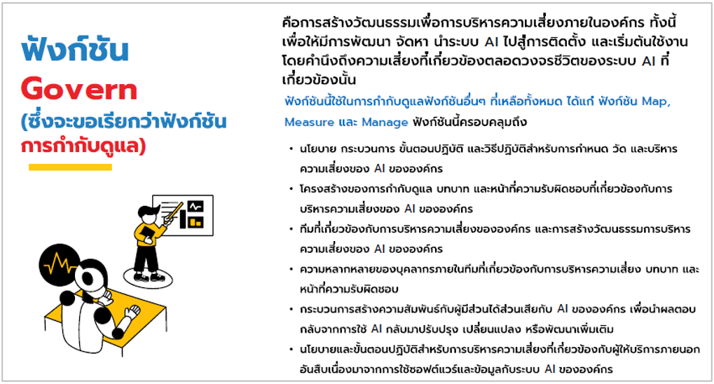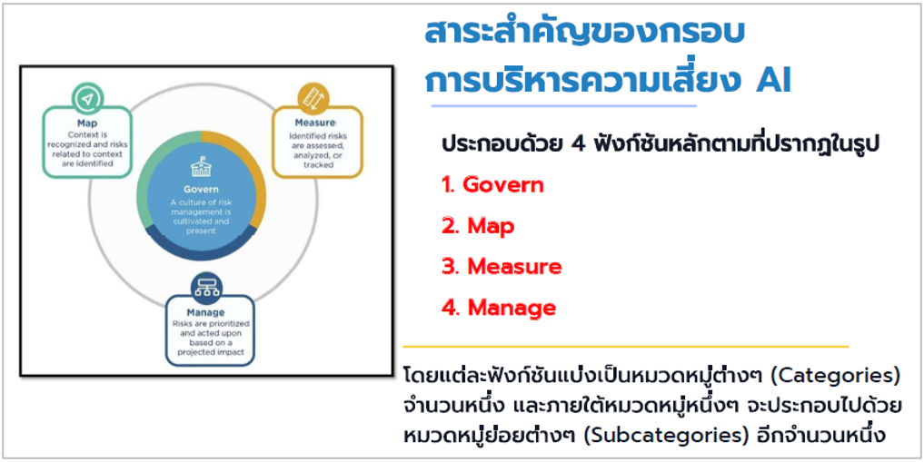 เป็นการเรียนรู้มาตรฐาน AI ที่เกี่ยวข้องในปัจจุบัน สำหรับใช้เป็นแนวทาง ในการอ้างอิงที่สากลยอมรับ วิธีการและมาตรการที่ช่วยป้องกันปัญหาความเสี่ยงในระบบ AI รวมถึงฝึกการประเมินและจัดการความเสี่ยงในโครงการ AI เพื่อให้สามารถควบคุมความเสี่ยงให้อยู่ในระดับที่ยอมรับได้ ตลอดจนนำความรู้ที่ได้มาปรับใช้ให้เหมาะสมกับองค์กร เพื่อให้ได้ระบบ AI ที่มีความน่าเชื่อถือและพร้อม ใช้งานได้ต่อไป เนื่องจากผู้เขียนมีโอกาสได้เข้าร่วมรับการฝึกอบรมเชิงปฏิบัติการ ที่จัดขึ้นสำนักงานพัฒนาวิทยาศาสตร์และเทคโนโลยีแห่งชาติ (สวทช.) โดยสถาบันพัฒนาบุคลากรแห่งอนาคต ระหว่างวันที่ 1-2 เมษายน 2568 รวมจำนวน 2 วัน ซึ่งได้รับความรู้ความเข้าใจและมีทักษะเกี่ยวกับการกำกับดูแล AI อย่างมีธรรมาภิบาลและความรับผิดชอบ โดยสรุปพอสังเขป ดังนี้ 1. หลักการจริยธรรมปัญญาประดิษฐ์ของสำนักงานคณะกรรมการดิจิทัลเพื่อเศรษฐกิจและสังคมแห่งชาติ (สดช) ประกอบด้วย 6 หลักการดังนี้ -