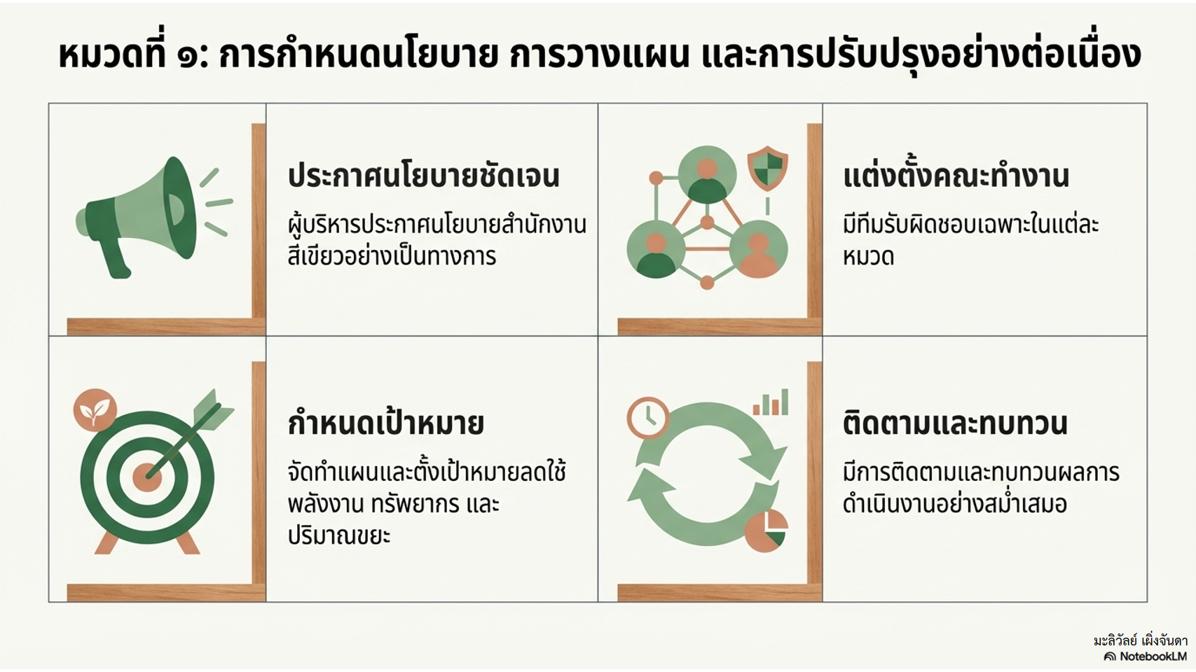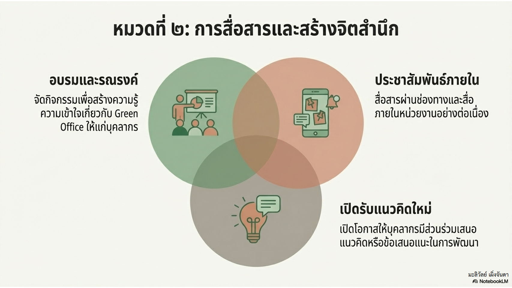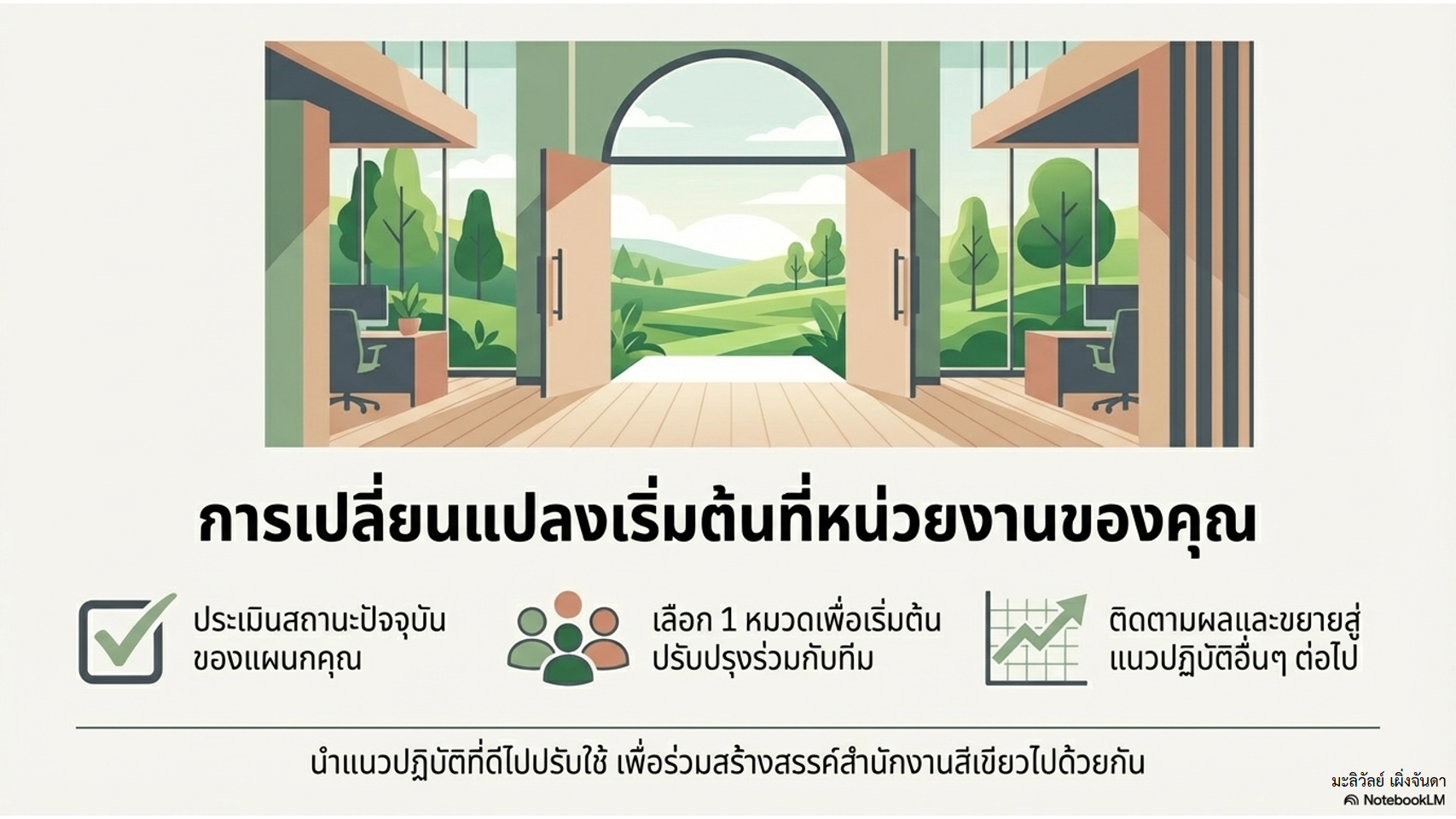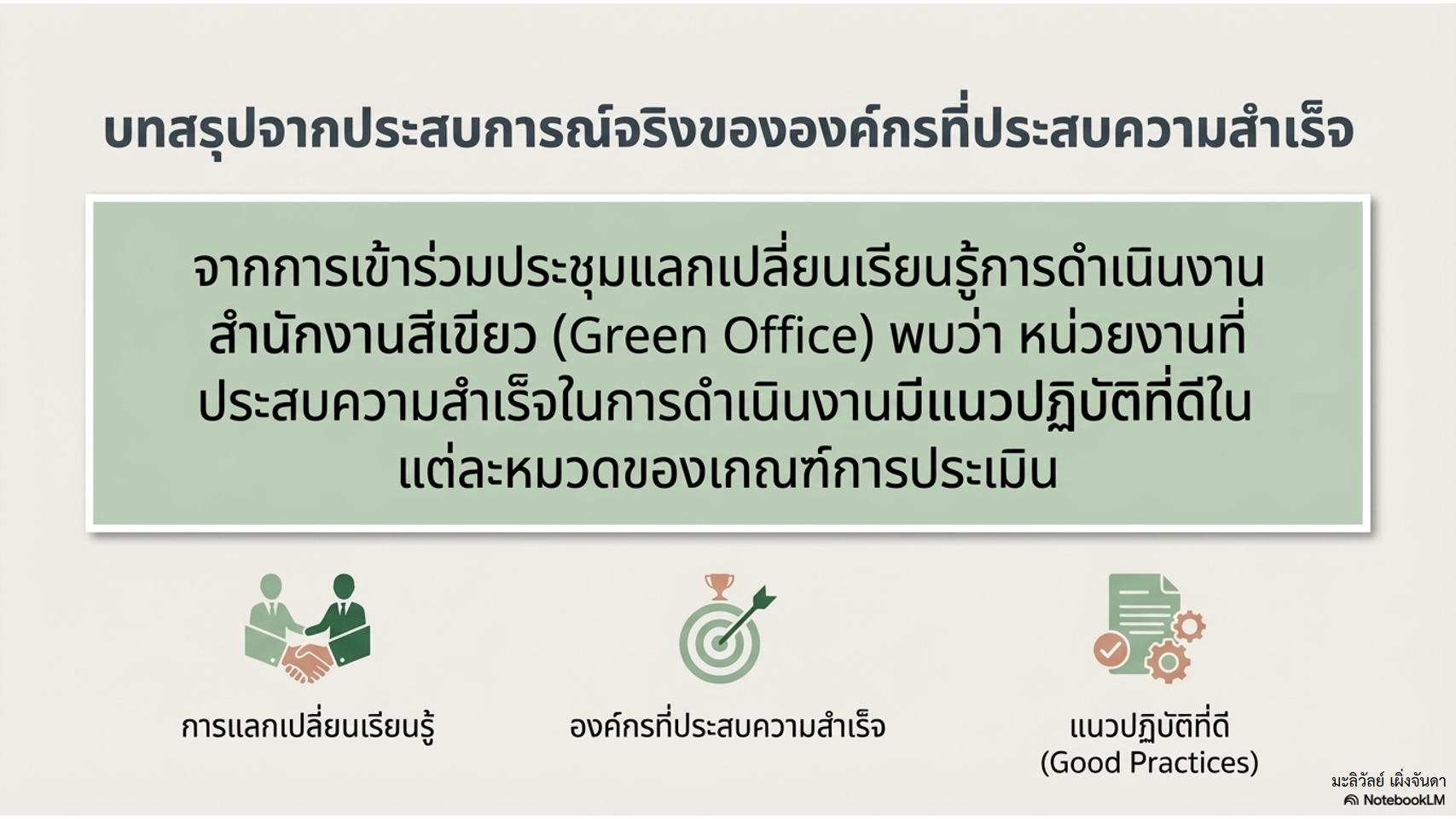 2) หน่วยงานที่ผ่านการรับรองระดับดีเยี่ยม (G ทอง) ที่มีคะแนนรวมร้อยละ 90 ขึ้นไป จะต้องมีคะแนนในแต่ละหมวดมากกว่าร้อยละ 80 แต่หากมีหมวดใดมีคะแนนไม่ถึงร้อยละ 80 จะได้รับการรับรองในระดับรองลงมา คือ ระดับดีมาก (G เงิน) 3) หน่วยงานที่มีคะแนนรวมน้อยกว่าร้อยละ 60 จะไม่ผ่านเกณฑ์การประเมินสำนักงานสีเขียว >>> อ้างอิงข้อมูลจาก กองส่งเสริมการมีส่วนร่วมต่อการเปลี่ยนแปลงสภาพภูมิอากาศและสิ่งแวดล้อม กรมการเปลี่ยนแปลงสภาพภูมิอากาศและสิ่งแวดล้อม องค์ความรู้สำคัญที่ได้รับ การดำเนินงานสำนักงานสีเขียวมุ่งเน้นการปรับเปลี่ยนพฤติกรรมของบุคลากรและการมีส่วนร่วมขององค์กร โดยมีแนวทางสำคัญ ได้แก่ • การใช้พลังงานและทรัพยากรอย่างคุ้มค่า • การลดการใช้กระดาษและส่งเสริมเอกสารอิเล็กทรอนิกส์ • การคัดแยกและลดปริมาณขยะตามหลัก 3R • การจัดซื้อจัดจ้างที่เป็นมิตรกับสิ่งแวดล้อม • การสร้างสภาพแวดล้อมการทำงานที่สะอาด เป็นระเบียบ และปลอดภัย แนวปฏิบัติที่ดีจากการแลกเปลี่ยนเรียนรู้การดำเนินงานสำนักงานสีเขียว (Green Office) จากการเข้าร่วมประชุมแลกเปลี่ยนเรียนรู้การดำเนินงานสำนักงานสีเขียว (Green Office) พบว่า หน่วยงานที่ประสบความสำเร็จในการดำเนินงานมีแนวปฏิบัติที่ดีในแต่ละหมวดของเกณฑ์การประเมิน ดังนี้ หมวดที่ 1 การกำหนดนโยบาย การวางแผน และการปรับปรุงอย่างต่อเนื่อง ผู้บริหารประกาศนโยบายสำนักงานสีเขียวอย่างชัดเจน แต่งตั้งคณะทำงานรับผิดชอบแต่ละหมวด จัดทำแผนการดำเนินงานและกำหนดเป้าหมายด้านการลดใช้พลังงาน ทรัพยากร และปริมาณขยะ พร้อมมีการติดตามและทบทวนผลการดำเนินงานอย่างสม่ำเสมอ หมวดที่ 2 การสื่อสารและสร้างจิตสำนึก จัดอบรมและกิจกรรมรณรงค์เพื่อสร้างความรู้ความเข้าใจเกี่ยวกับ Green Office ให้แก่บุคลากร มีการประชาสัมพันธ์ผ่านสื่อภายในหน่วยงาน และเปิดโอกาสให้บุคลากรมีส่วนร่วมเสนอแนวคิดหรือข้อเสนอแนะในการพัฒนาการดำเนินงาน หมวดที่ 3 การใช้ทรัพยากรและพลังงาน กำหนดมาตรการประหยัดพลังงาน เช่น การตั้งอุณหภูมิแอร์ 25°C การปิดไฟและเครื่องใช้ไฟฟ้าเมื่อไม่ใช้งาน ส่งเสริมการใช้เอกสารอิเล็กทรอนิกส์ เพื่อลดการใช้กระดาษ และมีการบันทึกข้อมูลการใช้พลังงานและทรัพยากรรายเดือนเพื่อนำมาวิเคราะห์และปรับปรุง หมวดที่ 4 การจัดการของเสีย จัดให้มีการคัดแยกขยะตามประเภท พร้อมติดป้ายบ่งชี้ชัดเจน มีจุดรวบรวมขยะของหน่วยงาน บันทึกข้อมูลปริมาณขยะ และส่งเสริมการลดขยะ เช่น การใช้แก้วน้ำส่วนตัว การลดการใช้พลาสติกแบบใช้ครั้งเดียว หมวดที่ 5 สภาพแวดล้อมและความปลอดภัย ดำเน