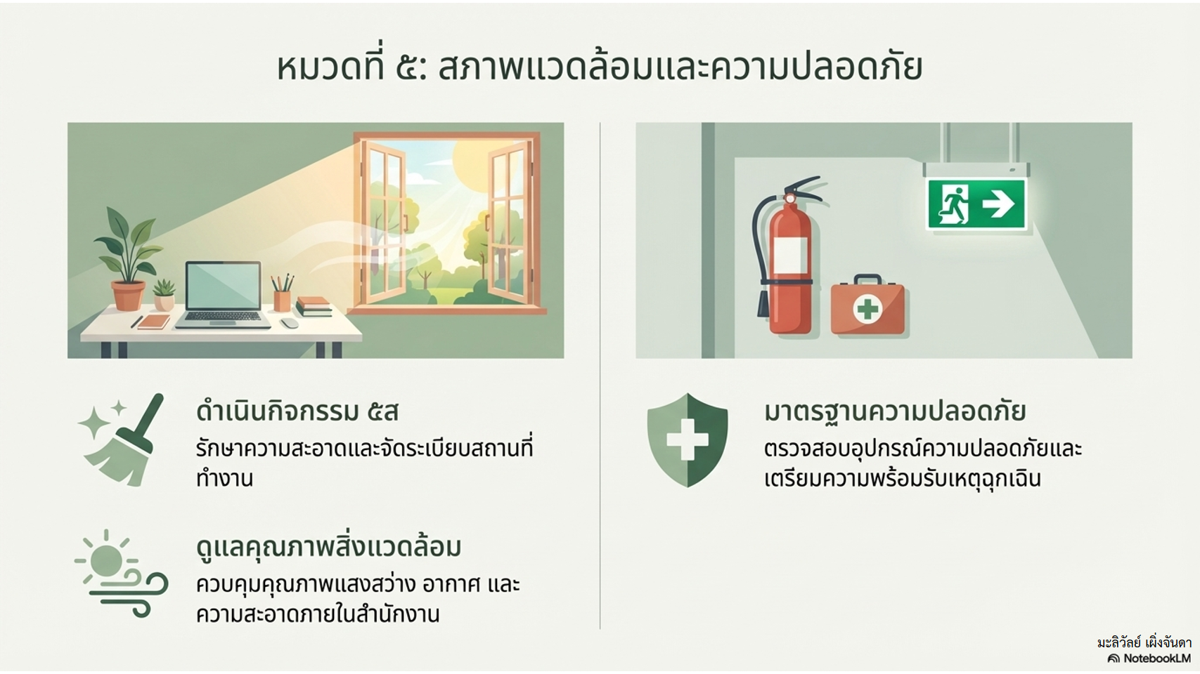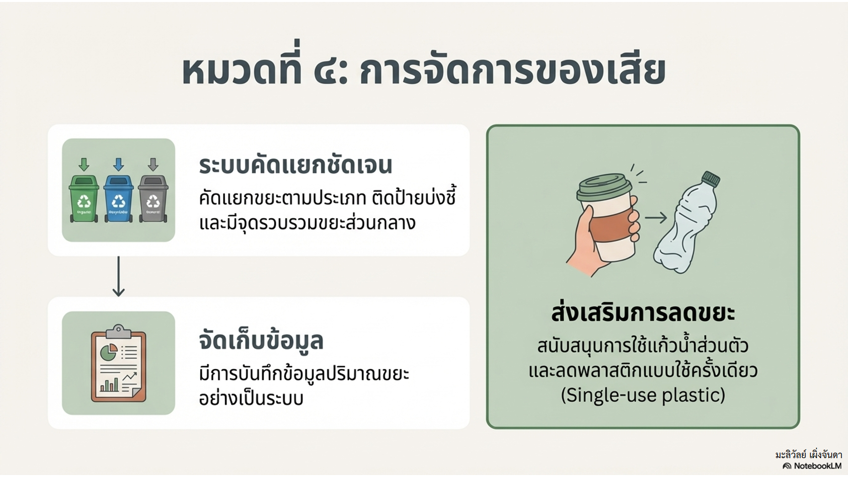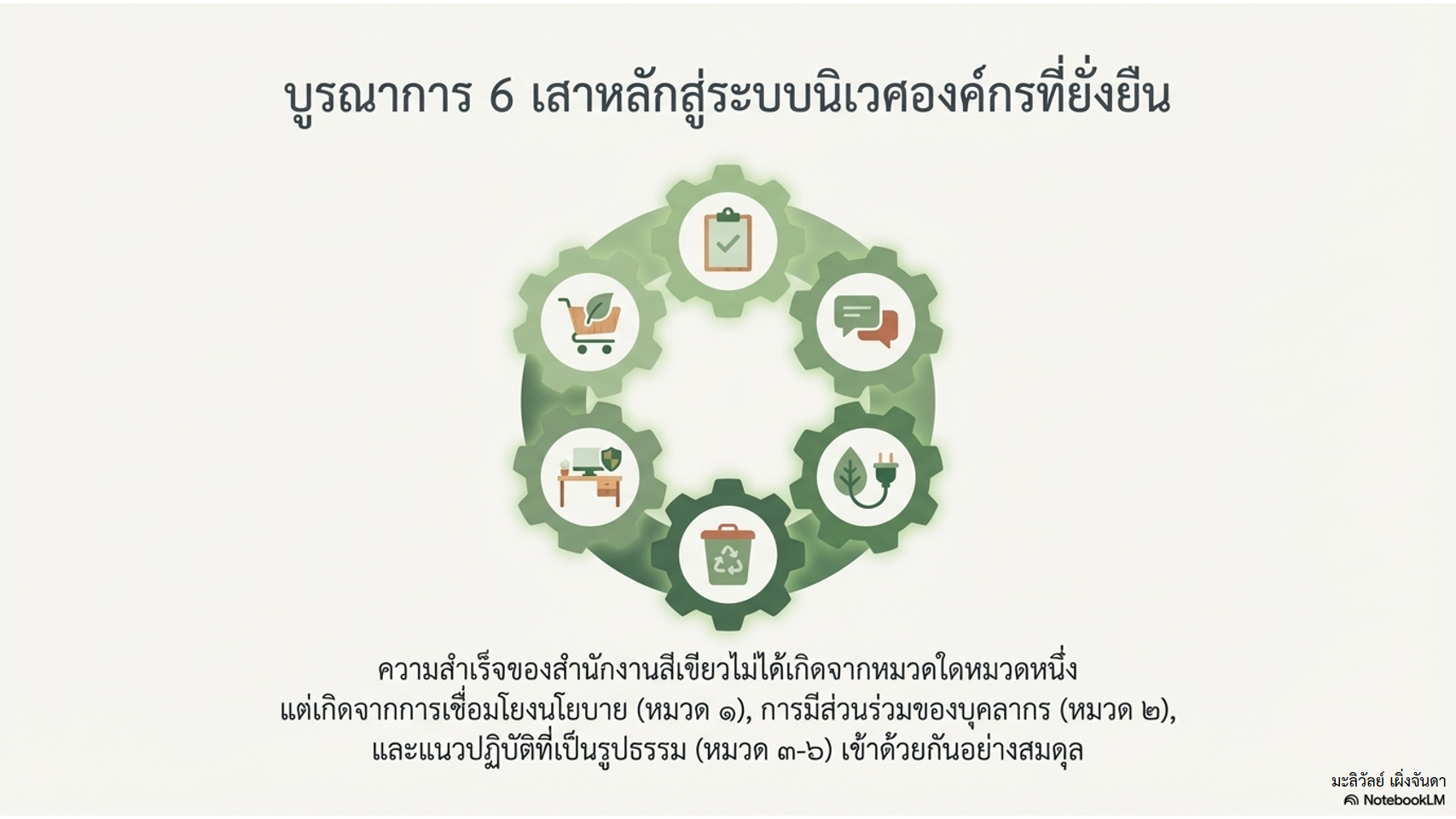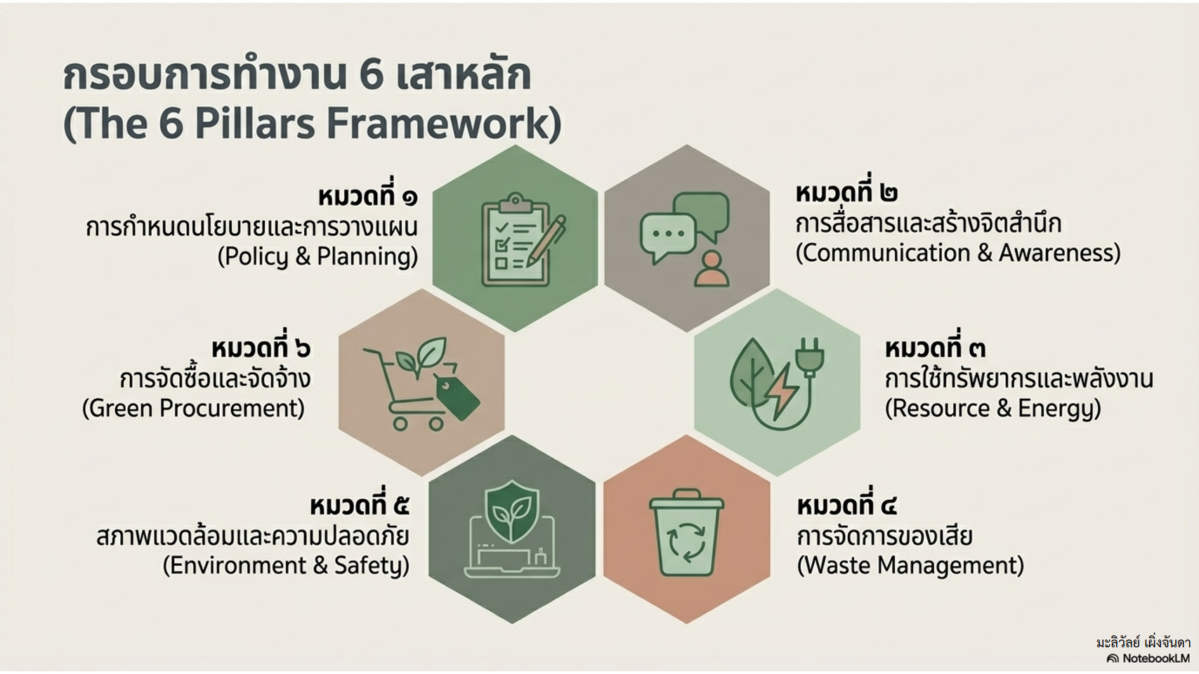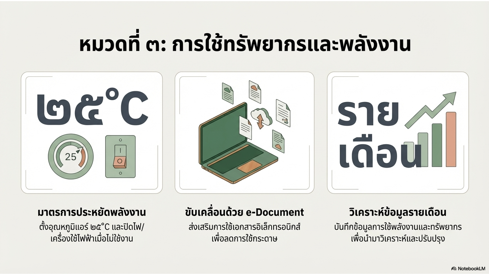2) หน่วยงานที่ผ่านการรับรองระดับดีเยี่ยม (G ทอง) ที่มีคะแนนรวมร้อยละ 90 ขึ้นไป จะต้องมีคะแนนในแต่ละหมวดมากกว่าร้อยละ 80 แต่หากมีหมวดใดมีคะแนนไม่ถึงร้อยละ 80 จะได้รับการรับรองในระดับรองลงมา คือ ระดับดีมาก (G เงิน) 3) หน่วยงานที่มีคะแนนรวมน้อยกว่าร้อยละ 60 จะไม่ผ่านเกณฑ์การประเมินสำนักงานสีเขียว >>> อ้างอิงข้อมูลจาก กองส่งเสริมการมีส่วนร่วมต่อการเปลี่ยนแปลงสภาพภูมิอากาศและสิ่งแวดล้อม กรมการเปลี่ยนแปลงสภาพภูมิอากาศและสิ่งแวดล้อม องค์ความรู้สำคัญที่ได้รับ การดำเนินงานสำนักงานสีเขียวมุ่งเน้นการปรับเปลี่ยนพฤติกรรมของบุคลากรและการมีส่วนร่วมขององค์กร โดยมีแนวทางสำคัญ ได้แก่ • การใช้พลังงานและทรัพยากรอย่างคุ้มค่า • การลดการใช้กระดาษและส่งเสริมเอกสารอิเล็กทรอนิกส์ • การคัดแยกและลดปริมาณขยะตามหลัก 3R • การจัดซื้อจัดจ้างที่เป็นมิตรกับสิ่งแวดล้อม • การสร้างสภาพแวดล้อมการทำงานที่สะอาด เป็นระเบียบ และปลอดภัย แนวปฏิบัติที่ดีจากการแลกเปลี่ยนเรียนรู้การดำเนินงานสำนักงานสีเขียว (Green Office) จากการเข้าร่วมประชุมแลกเปลี่ยนเรียนรู้การดำเนินงานสำนักงานสีเขียว (Green Office) พบว่า หน่วยงานที่ประสบความสำเร็จในการดำเนินงานมีแนวปฏิบัติที่ดีในแต่ละหมวดของเกณฑ์การประเมิน ดังนี้ หมวดที่ 1 การกำหนดนโยบาย การวางแผน และการปรับปรุงอย่างต่อเนื่อง ผู้บริหารประกาศนโยบายสำนักงานสีเขียวอย่างชัดเจน แต่งตั้งคณะทำงานรับผิดชอบแต่ละหมวด จัดทำแผนการดำเนินงานและกำหนดเป้าหมายด้านการลดใช้พลังงาน ทรัพยากร และปริมาณขยะ พร้อมมีการติดตามและทบทวนผลการดำเนินงานอย่างสม่ำเสมอ หมวดที่ 2 การสื่อสารและสร้างจิตสำนึก จัดอบรมและกิจกรรมรณรงค์เพื่อสร้างความรู้ความเข้าใจเกี่ยวกับ Green Office ให้แก่บุคลากร มีการประชาสัมพันธ์ผ่านสื่อภายในหน่วยงาน และเปิดโอกาสให้บุคลากรมีส่วนร่วมเสนอแนวคิดหรือข้อเสนอแนะในการพัฒนาการดำเนินงาน หมวดที่ 3 การใช้ทรัพยากรและพลังงาน กำหนดมาตรการประหยัดพลังงาน เช่น การตั้งอุณหภูมิแอร์ 25°C การปิดไฟและเครื่องใช้ไฟฟ้าเมื่อไม่ใช้งาน ส่งเสริมการใช้เอกสารอิเล็กทรอนิกส์ เพื่อลดการใช้กระดาษ และมีการบันทึกข้อมูลการใช้พลังงานและทรัพยากรรายเดือนเพื่อนำมาวิเคราะห์และปรับปรุง หมวดที่ 4 การจัดการของเสีย จัดให้มีการคัดแยกขยะตามประเภท พร้อมติดป้ายบ่งชี้ชัดเจน มีจุดรวบรวมขยะของหน่วยงาน บันทึกข้อมูลปริมาณขยะ และส่งเสริมการลดขยะ เช่น การใช้แก้วน้ำส่วนตัว การลดการใช้พลาสติกแบบใช้ครั้งเดียว หมวดที่ 5 สภาพแวดล้อมและความปลอดภัย ดำเน