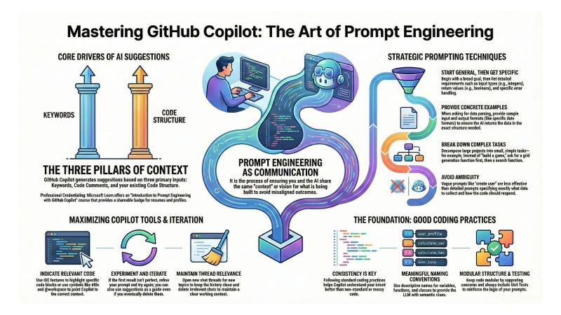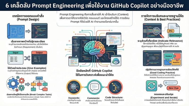 ![]() กลยุทธ์และแนวทางปฏิบัติที่สำคัญในการทำ Prompt Engineering เพื่อเพิ่มประสิทธิภาพการใช้งาน GitHub Copilot ซึ่งเป็นเครื่องมือ AI ที่ช่วยสนับสนุนการเขียนโค้ด การสร้างโปรเจกต์ และการจัดการ Pull Request หัวใจสำคัญของ Prompt Engineering ไม่ใช่สูตรลับ แต่คือ "การสื่อสารบริบท" (Context) เพื่อให้ AI เข้าใจเป้าหมายเดียวกับผู้ใช้งาน โดย GitHub Copilot ทำงานบนพื้นฐานของ Large Language Model (LLM) ที่คาดเดาลำดับคำจากคีย์เวิร์ด คอมเมนต์ และโครงสร้างของโค้ด การประยุกต์ใช้เทคนิคต่างๆ เช่น การเริ่มต้นจากภาพกว้างไปสู่รายละเอียด การให้ตัวอย่างข้อมูล และการย่อยงานที่ซับซ้อนให้เล็กลง จะช่วยให้ได้ผลลัพธ์ที่แม่นยำและนำไปใช้งานได้จริง นอกจากนี้ การปฏิบัติตามมาตรฐานการเขียนโค้ดที่ดี (Good Coding Practices) ยังเป็นปัจจัยเสริมที่สำคัญที่ช่วยให้ AI ทำงานได้ดียิ่งขึ้น 1. นิยามและความสำคัญของ Prompt Engineering Prompt Engineering ในบริบทของ GitHub Copilot คือกระบวนการออกแบบคำสั่ง (Prompt) เพื่อบอกความต้องการแก่ AI อย่างครบถ้วนและชัดเจน