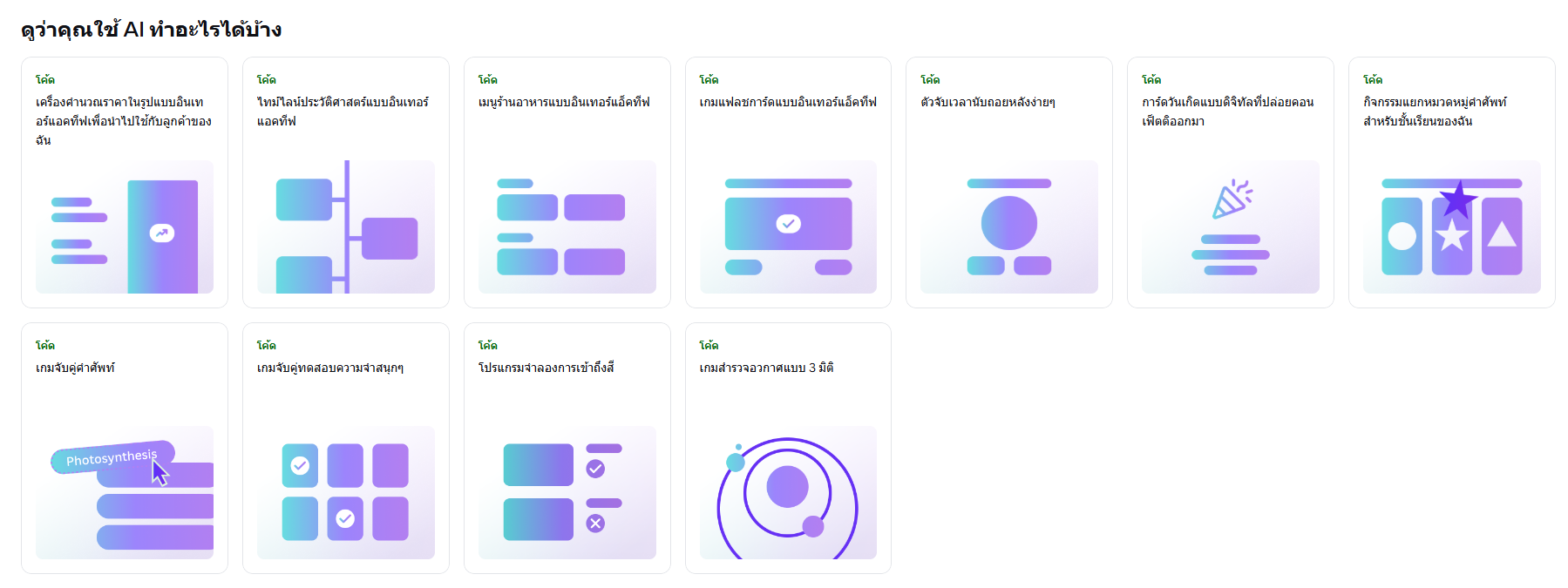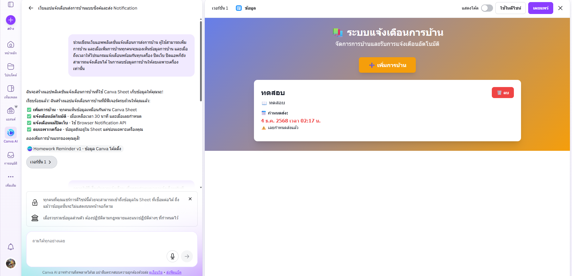 ขั้นตอนนี้ช่วยให้การพัฒนาโปรแกรมมีความรวดเร็วและยืดหยุ่นมากขึ้น ![]() ![]() ตัวอย่างโปรแกรมที่สามารถสร้างได้ ด้วยความสามารถของ Canva AI ผู้ใช้งานสามารถสร้างโปรแกรมหรือเครื่องมือดิจิทัลได้หลากหลายรูปแบบ เช่น