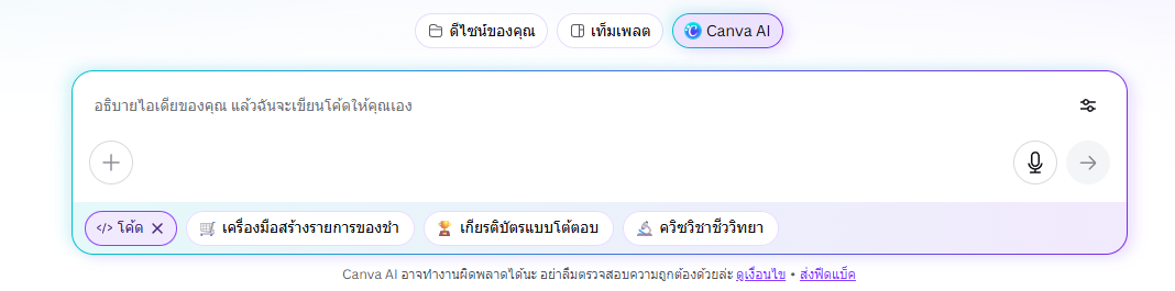 เครื่องมือเหล่านี้สามารถนำไปใช้ในด้านการศึกษา การฝึกอบรม หรือการพัฒนาเว็บไซต์และกิจกรรมออนไลน์ ขั้นตอนการสร้างโค้ดโปรแกรมด้วย Canva AI 1. เข้าใช้งานแพลตฟอร์ม Canva เริ่มต้นโดยเข้าสู่ระบบในแพลตฟอร์ม Canva จากนั้นเปิดใช้งานเครื่องมือ AI ภายในระบบ เพื่อเริ่มต้นสร้างแนวคิดหรือโค้ดของโปรแกรมที่ต้องการ 2. ระบุแนวคิดของโปรแกรม (Prompt) ผู้ใช้งานสามารถพิมพ์คำอธิบายเกี่ยวกับโปรแกรมที่ต้องการ เช่น