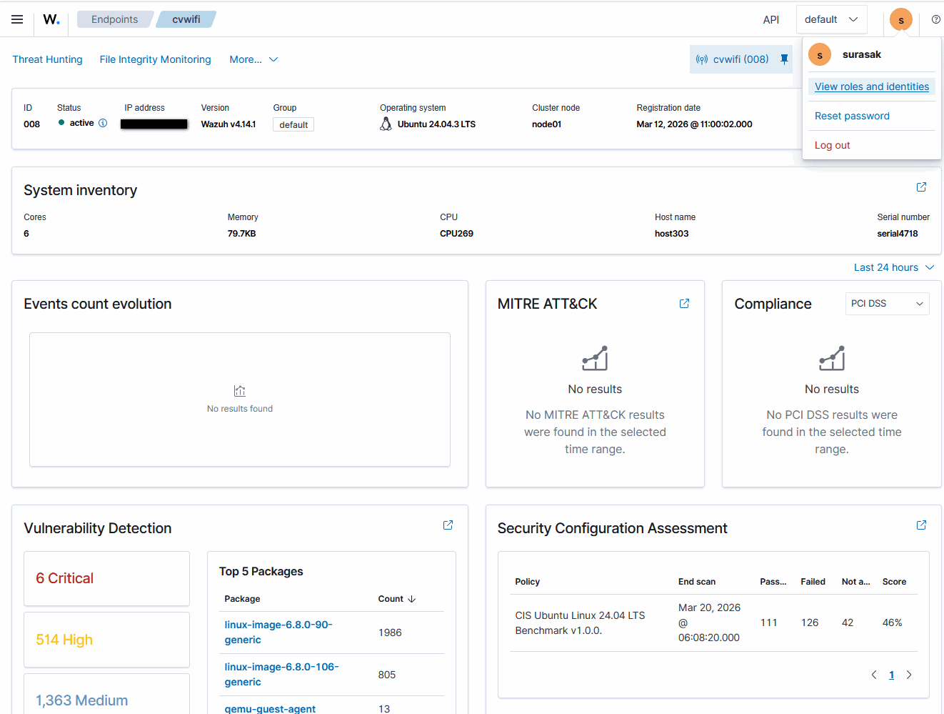 จาก Dashboard จะมีการสรุป Top Tactics และจำนวนเหตุการณ์ที่ตรวจพบ ช่วยสนับสนุนงาน Threat Hunting และ SOC ได้เป็นอย่างดี 5. Security Configuration Assessment และ ComplianceWazuh มีโมดูล Security Configuration Assessment (SCA) สำหรับตรวจสอบการตั้งค่าระบบตามมาตรฐานความปลอดภัย เช่น