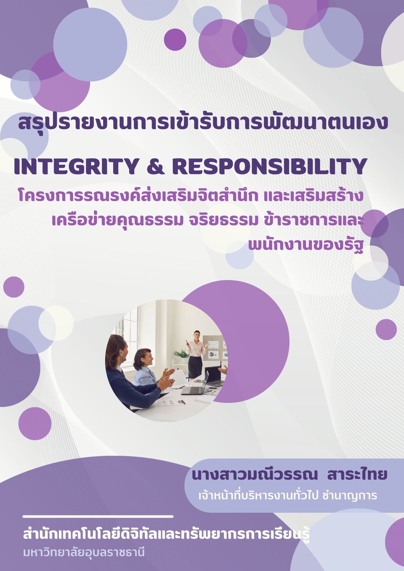 สรุปรายงานผลการเข้ารับการอบรมเพื่อการพัฒนาตนเอง รอบที่ 1/2569 นางสาวมณีวรรณ สาระไทย ตำแหน่งเจ้าหน้าที่บริหารงานทั่วไป ชำนาญการ สังกัดสำนักงานเลขานุการ สำนักเทคโนโลยีดิจิทัลและ... |