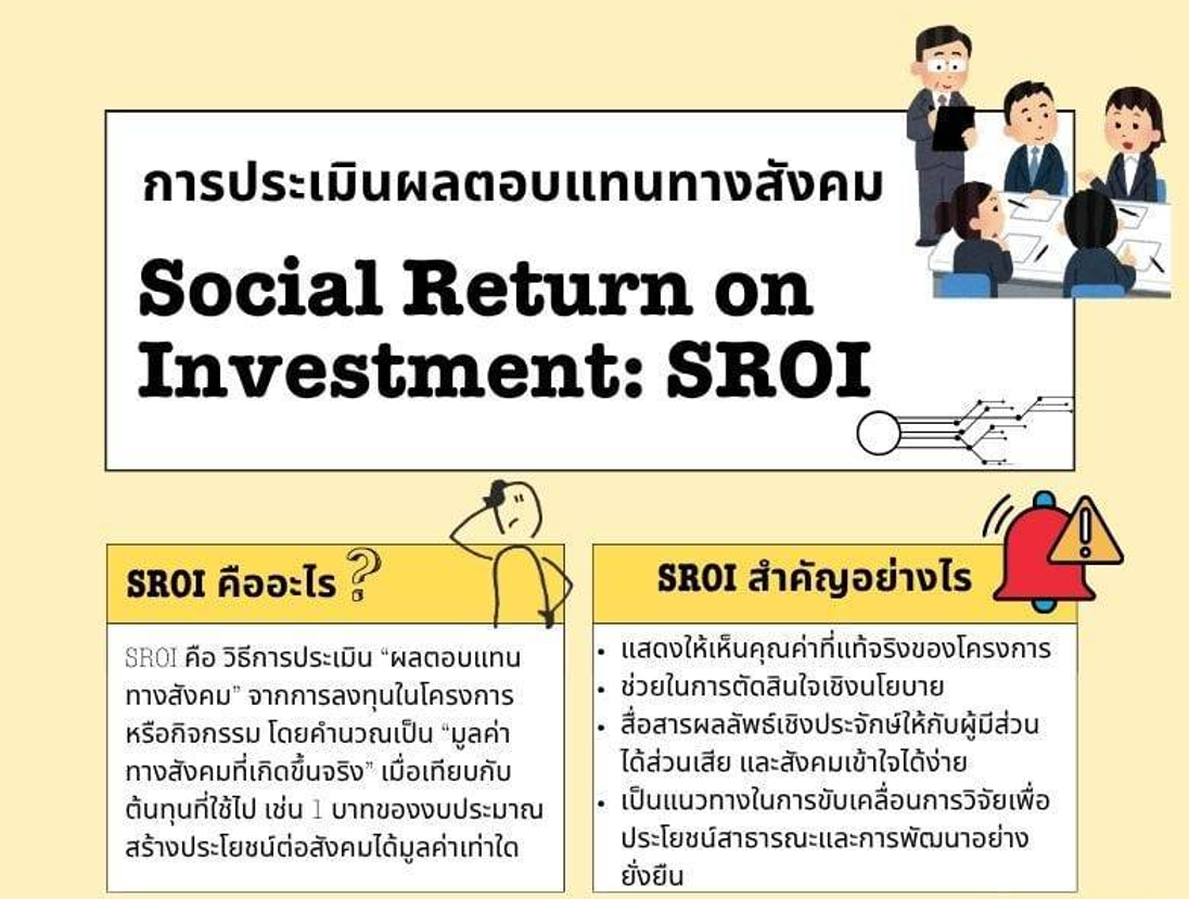 การประเมินผลตอบแทนทางสังคม Social Return on Investment: SROI นางสาวนาวินี สุตัญตั้งใจ SROI คือวิธีการประเมิน "ผลตอบแทนทางสังคม" จากการลงทุนในโครงการหรือกิจกรรม โดยคำนวณเป็น "มูลค่าทางสังคมที่เกิ... |