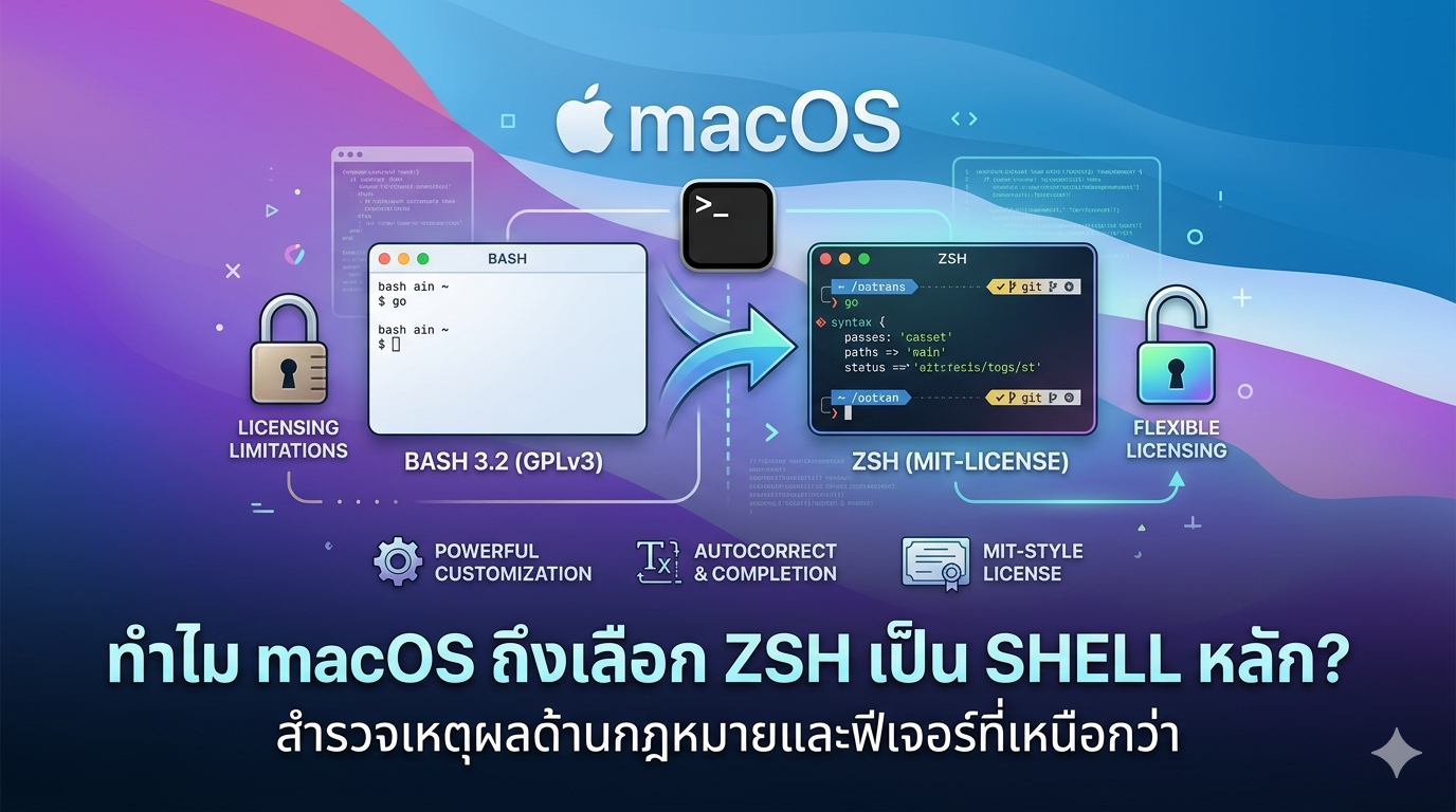 การที่ Apple ตัดสินใจเปลี่ยนจาก Bash มาเป็น Zsh (Z shell) เป็นค่าเริ่มต้น (default shell) ตั้งแต่ macOS Catalina (2019) มีเหตุผลหลักที่สำคัญในด้านข้อกฎหมายและประสิทธิภาพการทำงาน ดังนี้ 1. ปัญหาเรื่องลิขสิทธิ์ (Licensing) ... |