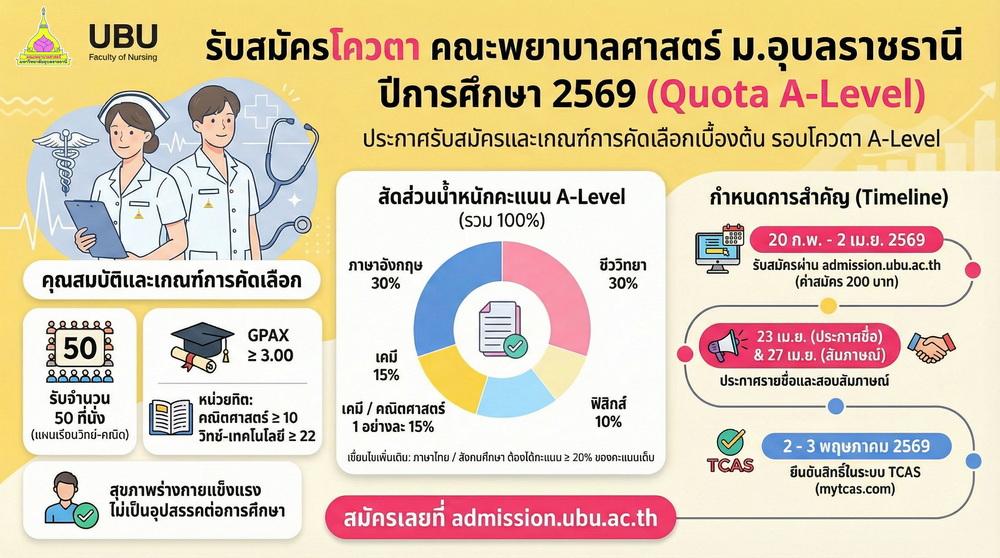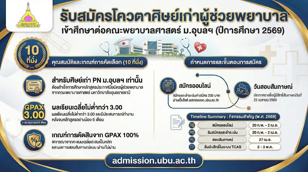 ประกาศรับสมัครคัดเลือกบุคคลเข้าศึกษาในมหาวิทยาลัยอุบลราชธานี โควตาศิษย์เก่าผู้สำเร็จการศึกษาหลักสูตรประกาศนียบัตรผู้ช่วยพยาบาล คณะพยาบาลศาสตร์ ประจำปีการศึกษา 256927 กุมภาพันธ์ 2569
