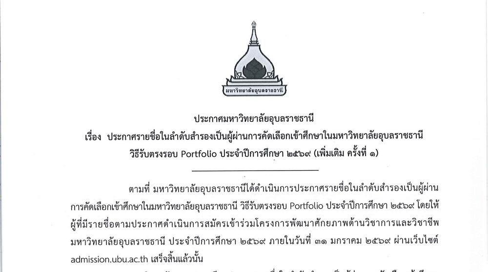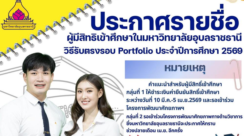 ประกาศรายชื่อผู้มีสิทธิเข้าศึกษา วิธีรับตรงรอบ Portfolio ประจำปีการศึกษา 256911 มีนาคม 2569