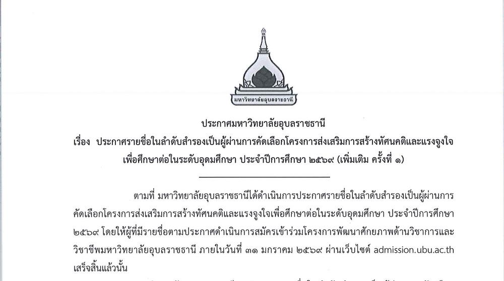 ประกาศรายชื่อในลำดับสำรอง เป็นผู้ผ่านการคัดเลือกโครงการส่งเสริมทัศนคติและแรงจูงใจฯ ประจำปีการศึกษา 2569 UBU i-Camp 2026 (เพิ่มเติม) 20 มีนาคม 2569