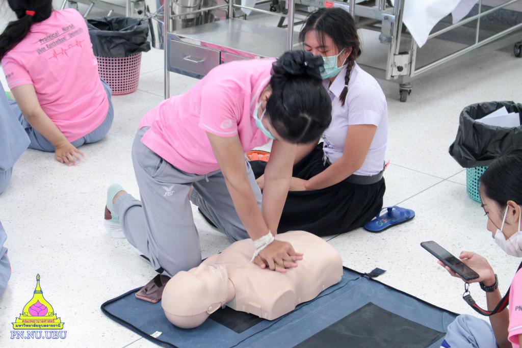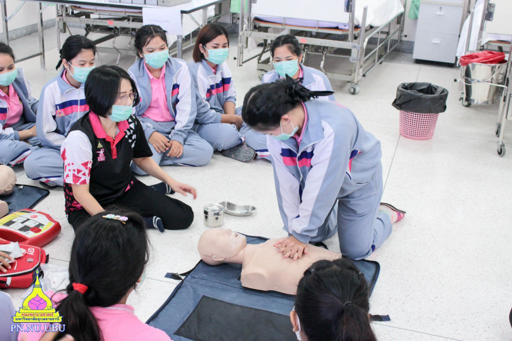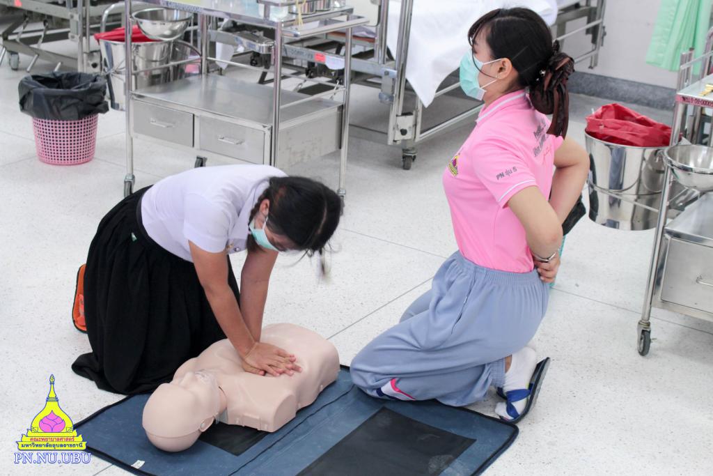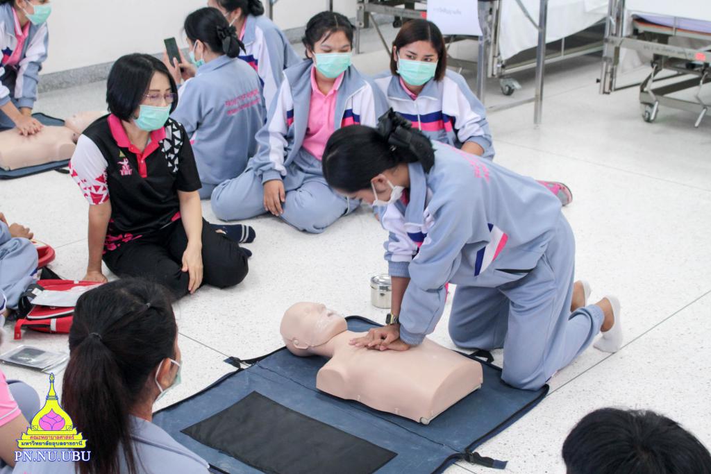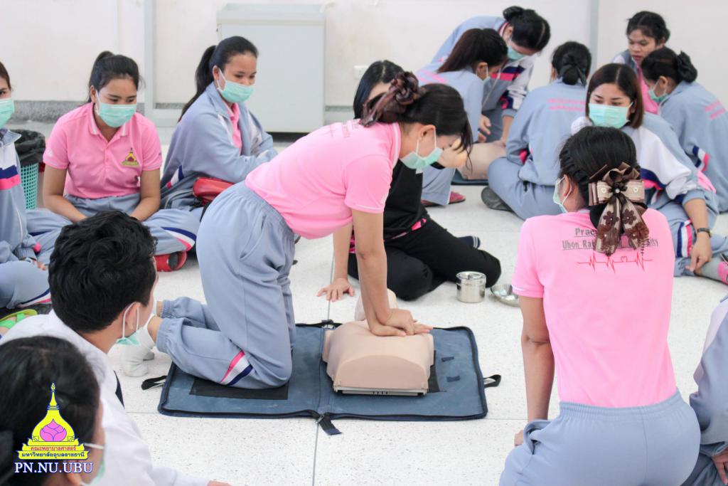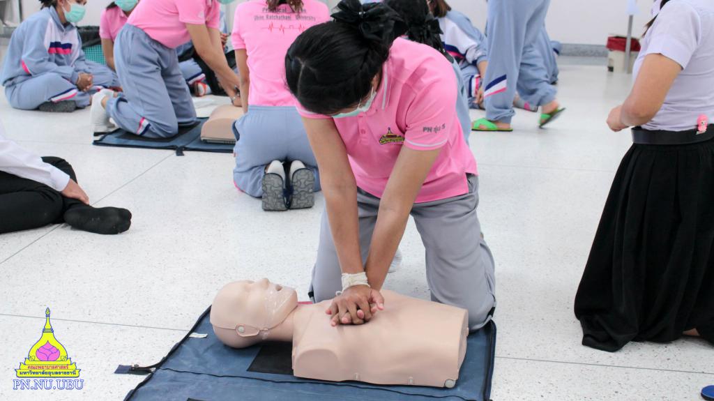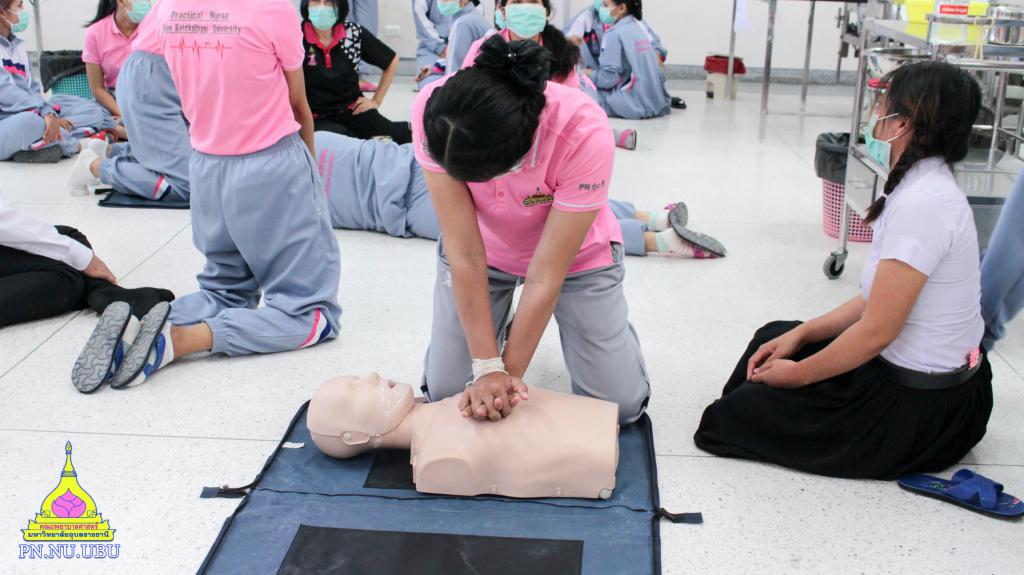 ผู้เข้าอบรมหลักสูตรประกาศนียบัตรผู้ช่วยพยาบาล (PN) รุ่นที่ 5 ฝึกการปฐมพยาบาลเบื้องต้น/การช่วยเหลือในภาวะฉุกเฉินและอุบัติเหตุ ในรายวิชา เทคนิกการช่วยเหลือดูแลผู้ใช้บริการขั้นพื้นฐาน
