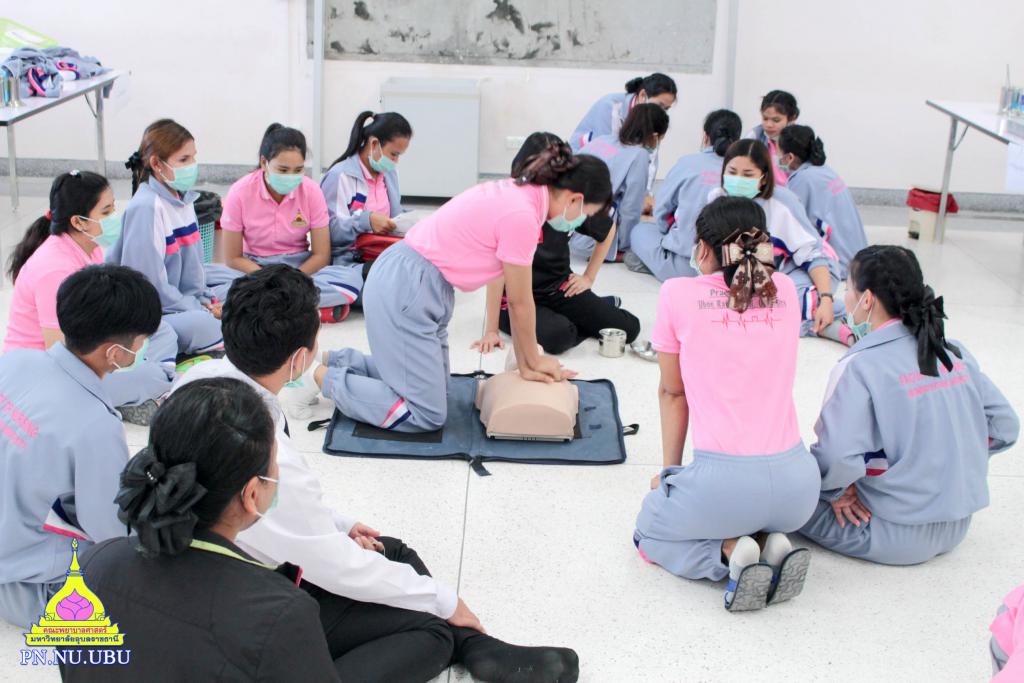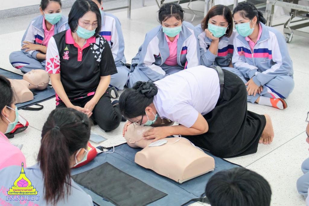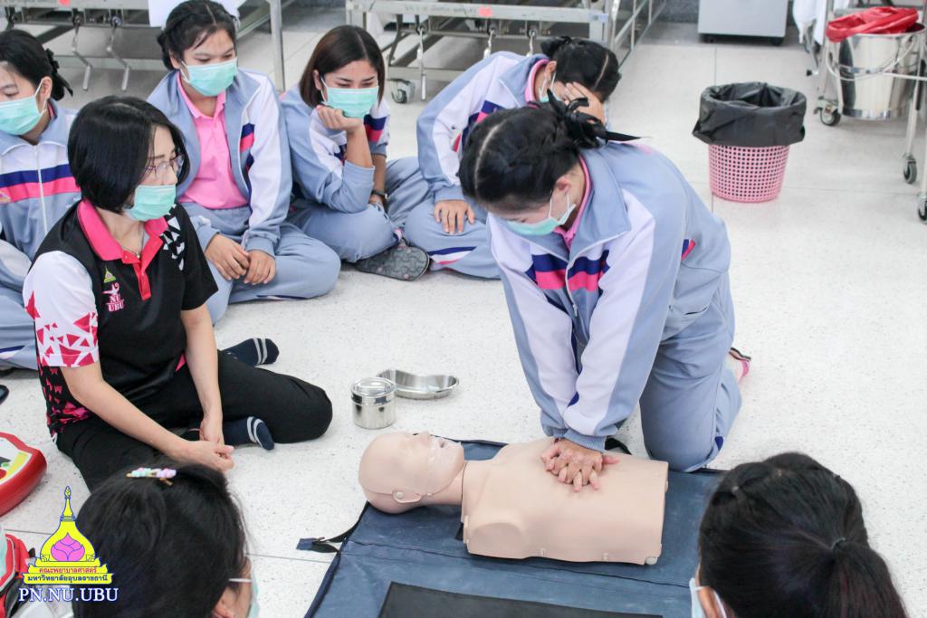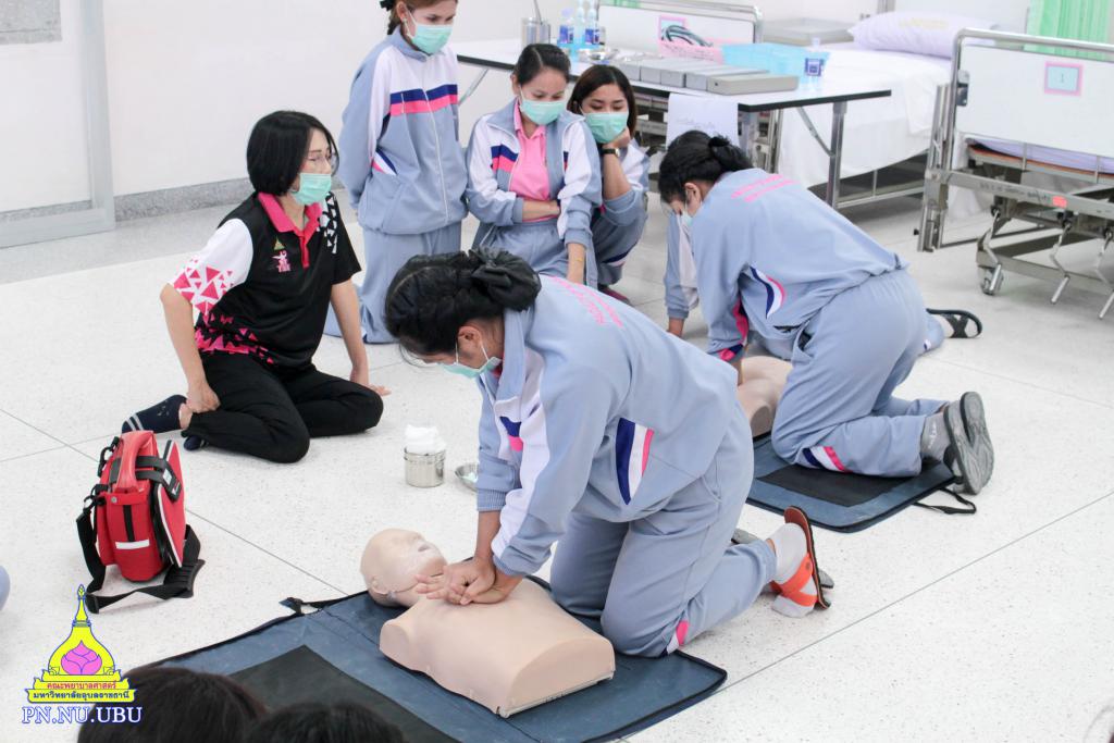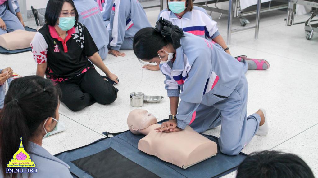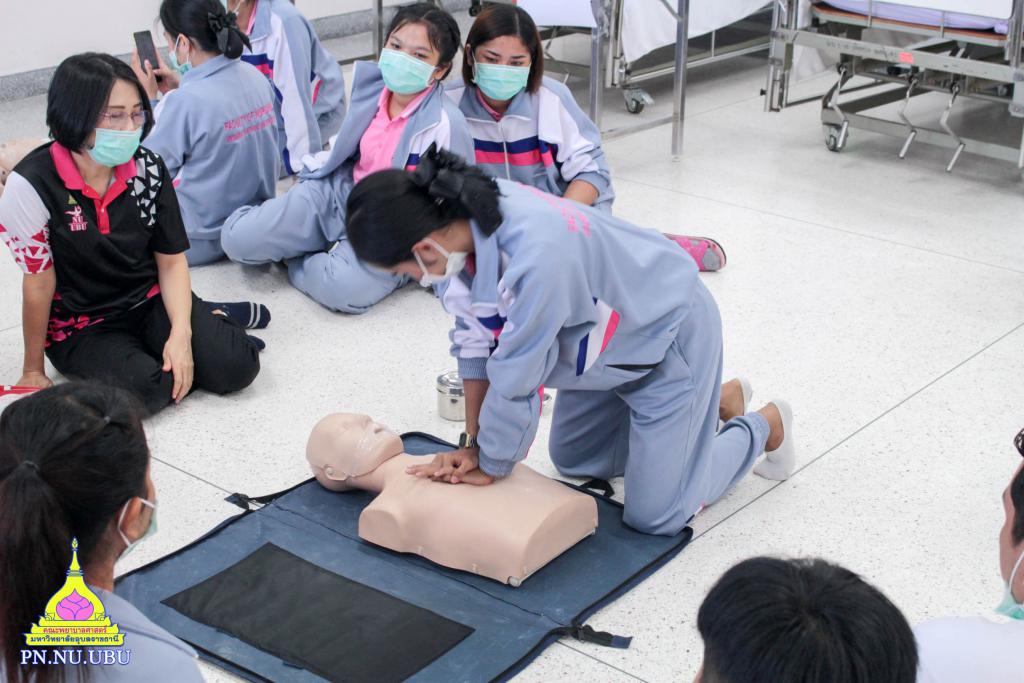 ผู้เข้าอบรมหลักสูตรประกาศนียบัตรผู้ช่วยพยาบาล (PN) รุ่นที่ 5 ฝึกการปฐมพยาบาลเบื้องต้น/การช่วยเหลือในภาวะฉุกเฉินและอุบัติเหตุ ในรายวิชา เทคนิกการช่วยเหลือดูแลผู้ใช้บริการขั้นพื้นฐาน