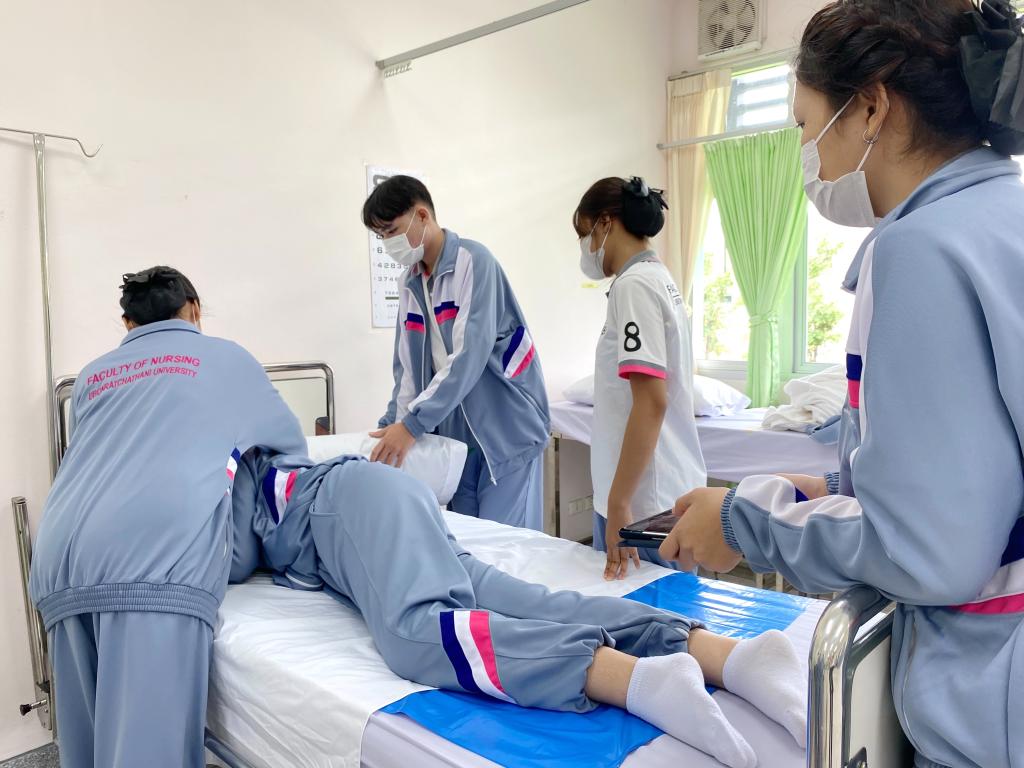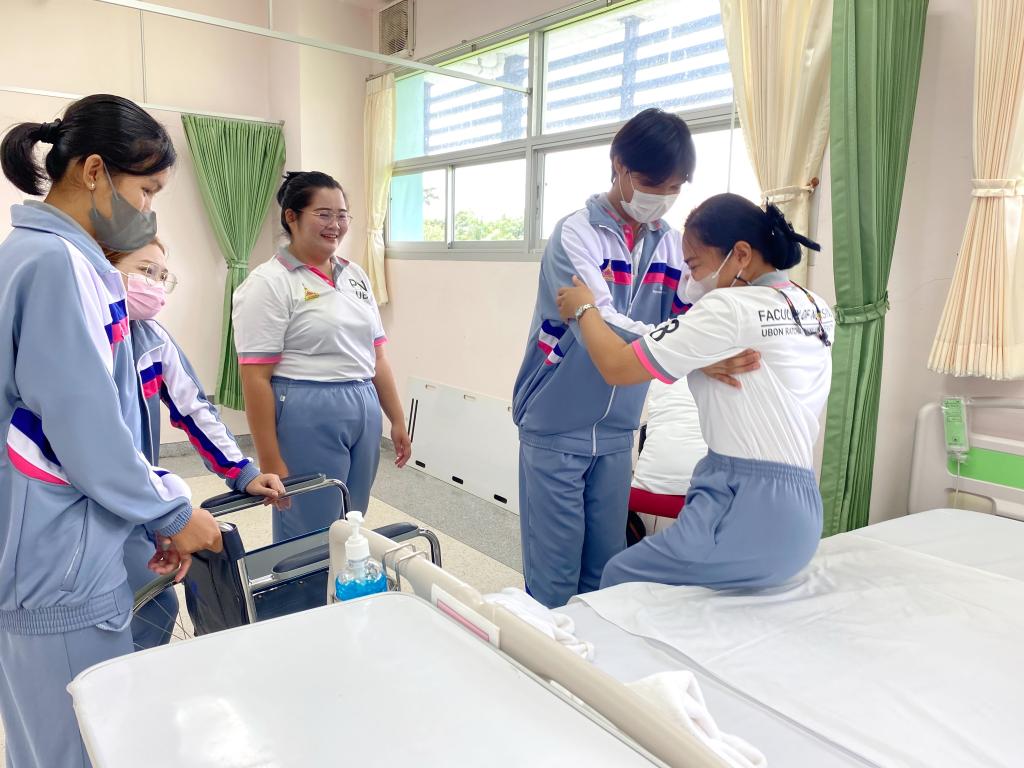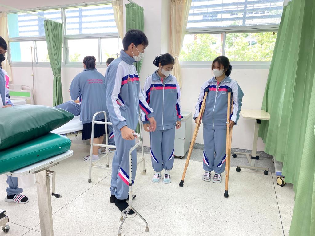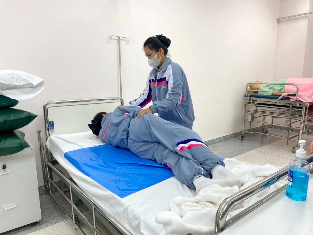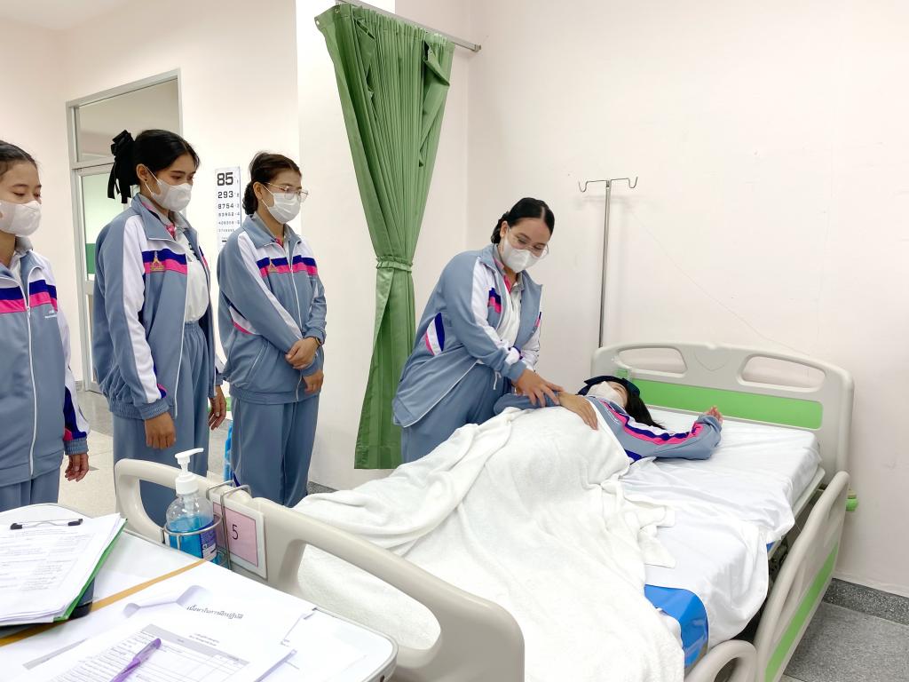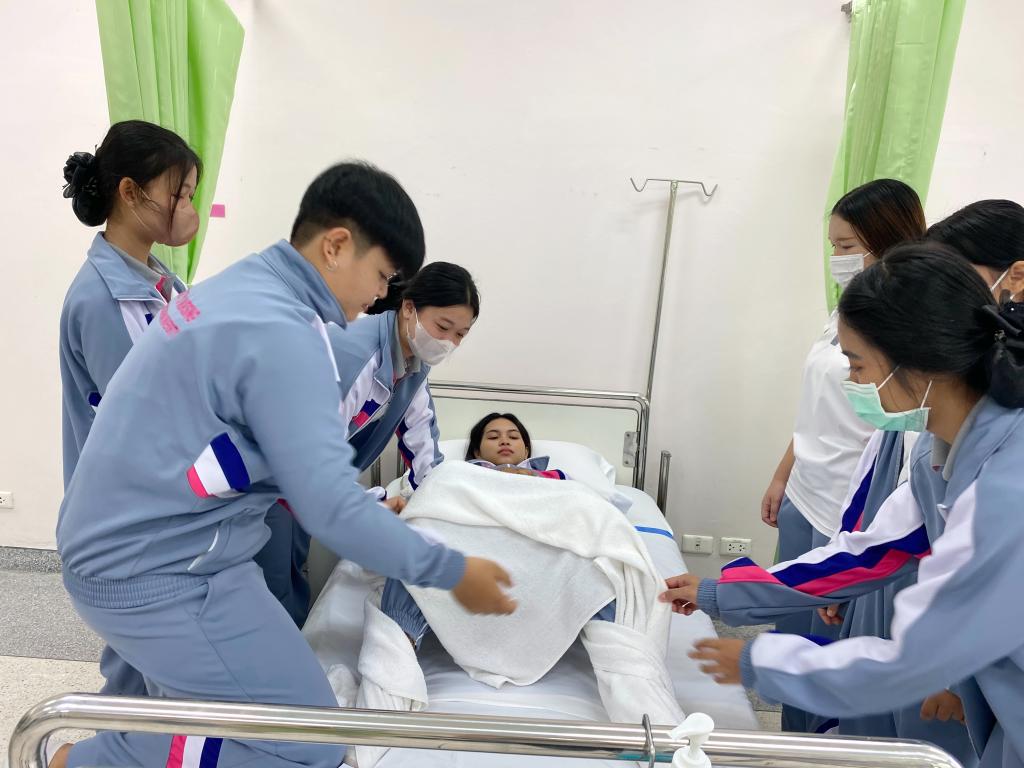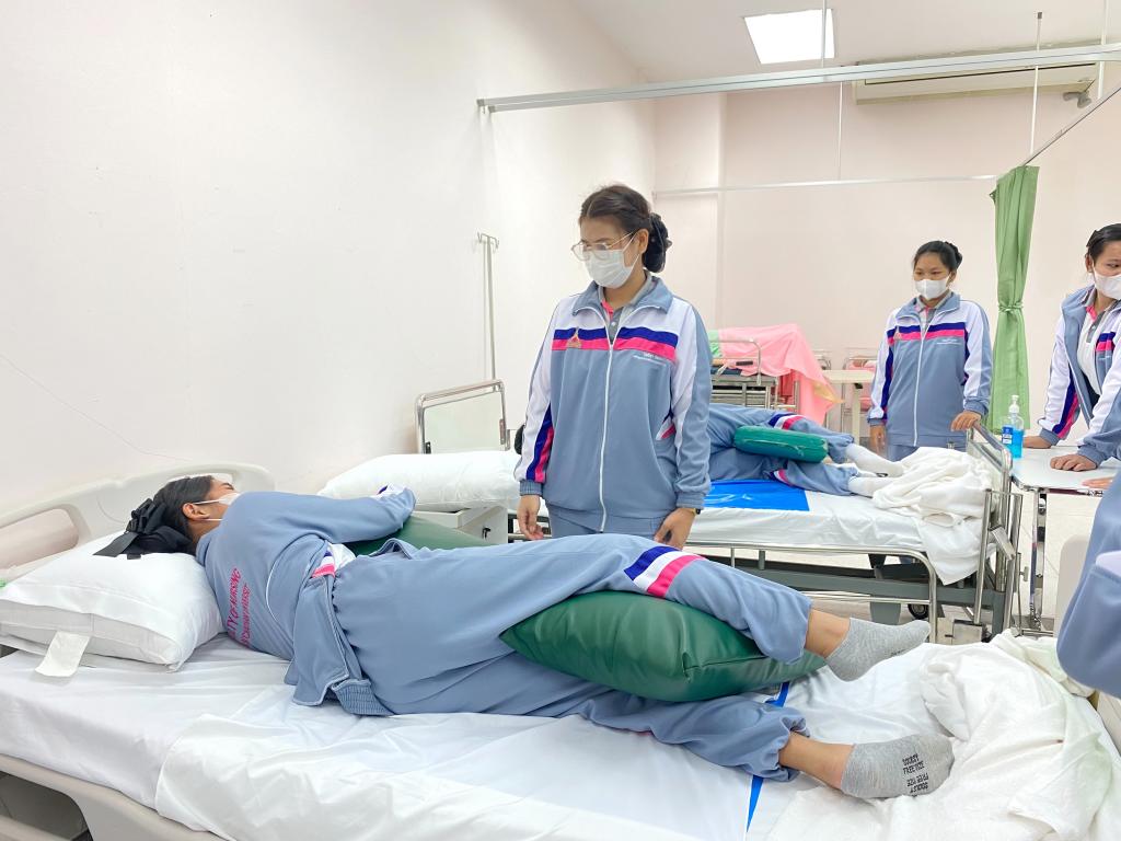 นักศึกษาหลักสูตรประกาศนียบัตรผู้ช่วยพยาบาล รุ่นที่ 8 ฝึกปฏิบัติการช่วยเหลือดูแล หัวข้อ การจัดท่าตรวจ/ยก เคลื่อนย้าย บริหารข้อและกล้ามเนื้อ ในรายวิชาเทคนิคการช่วยเหลือดูแลบุคคลขั้นพื้นฐาน ประจำภาคการศึกษา 1/2566