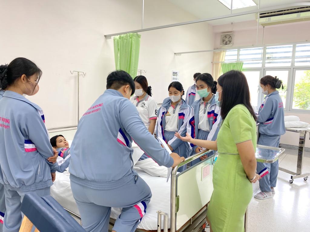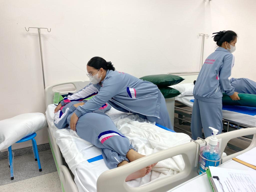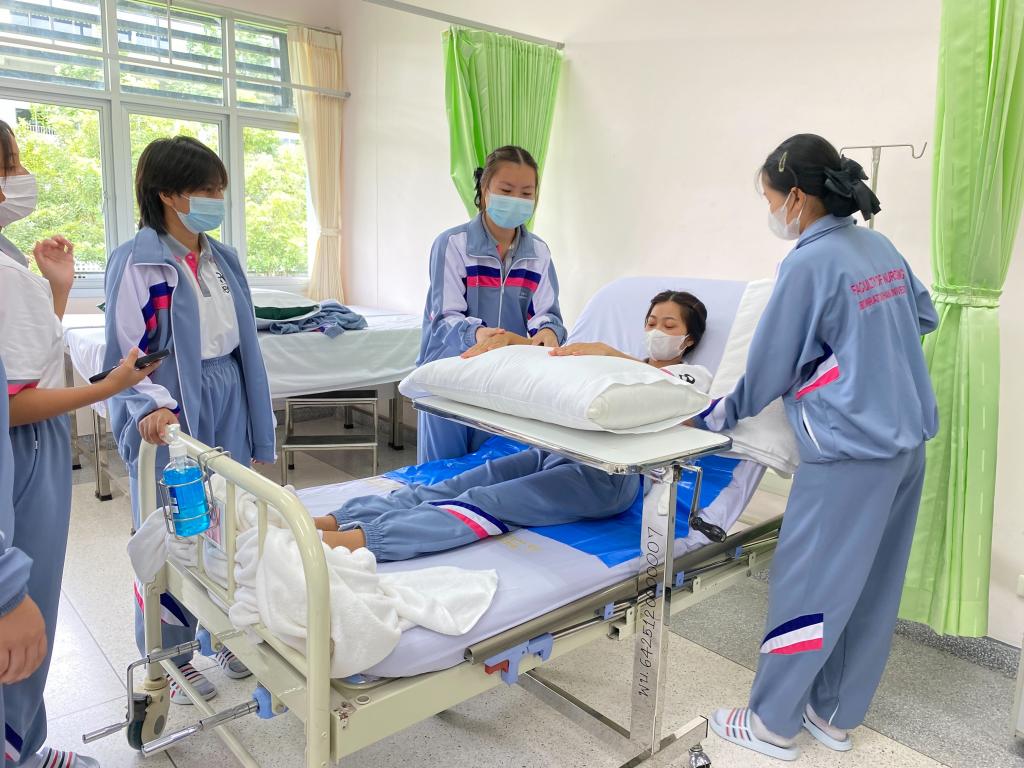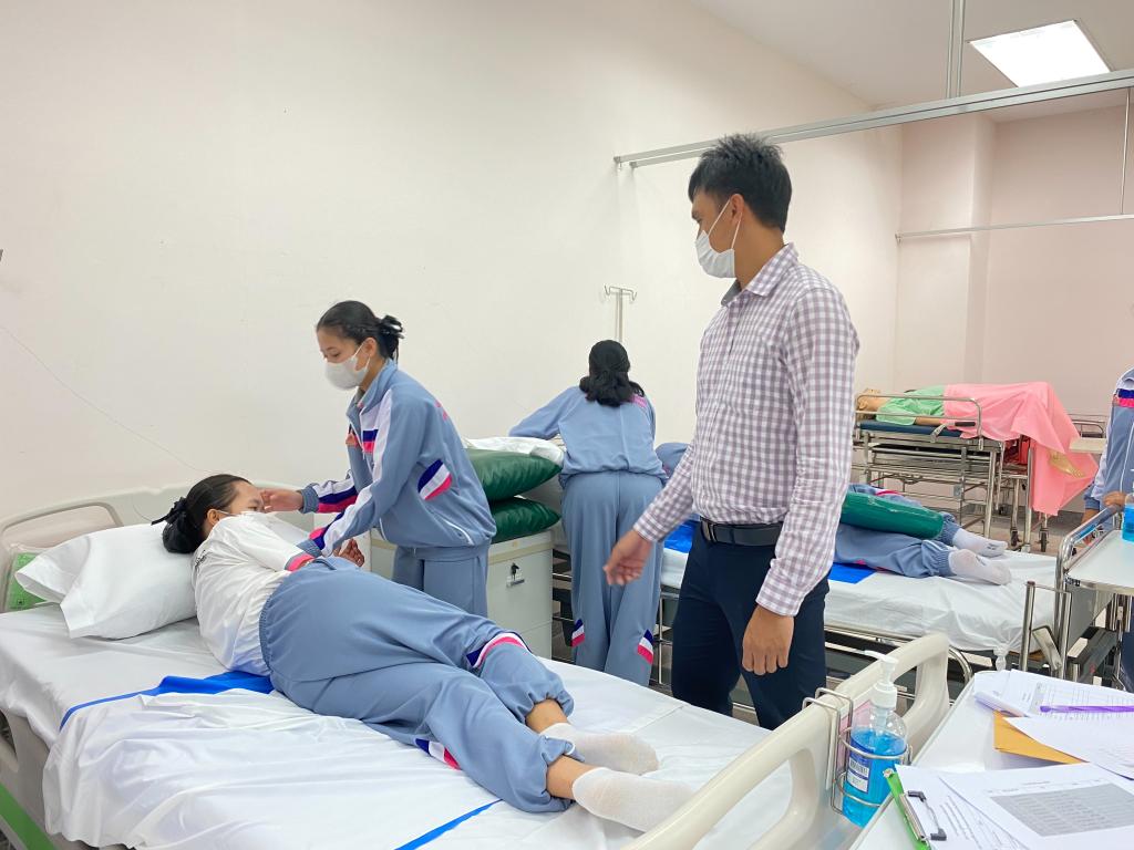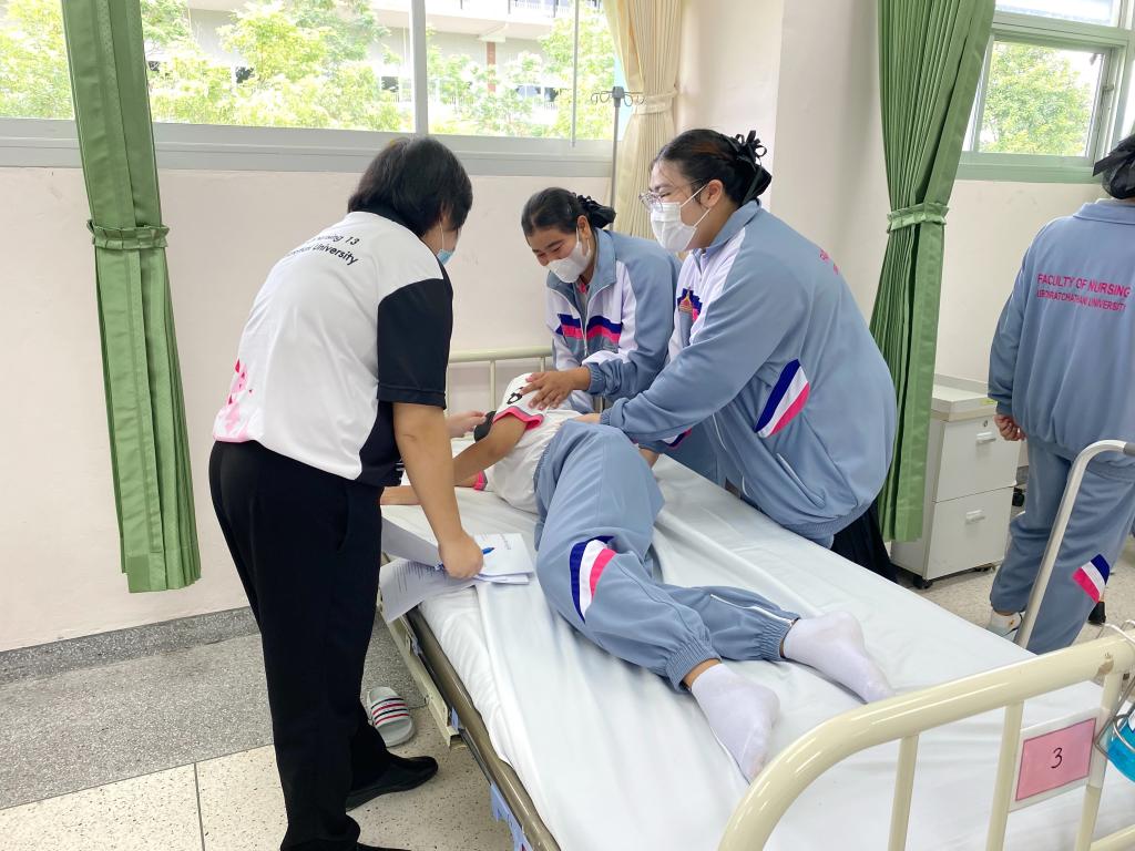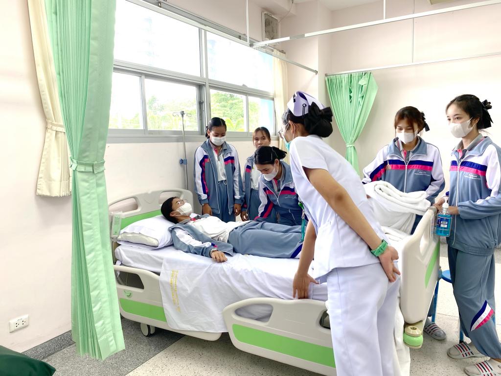 นักศึกษาหลักสูตรประกาศนียบัตรผู้ช่วยพยาบาล รุ่นที่ 8 ฝึกปฏิบัติการช่วยเหลือดูแล หัวข้อ การจัดท่าตรวจ/ยก เคลื่อนย้าย บริหารข้อและกล้ามเนื้อ ในรายวิชาเทคนิคการช่วยเหลือดูแลบุคคลขั้นพื้นฐาน ประจำภาคการศึกษา 1/2566