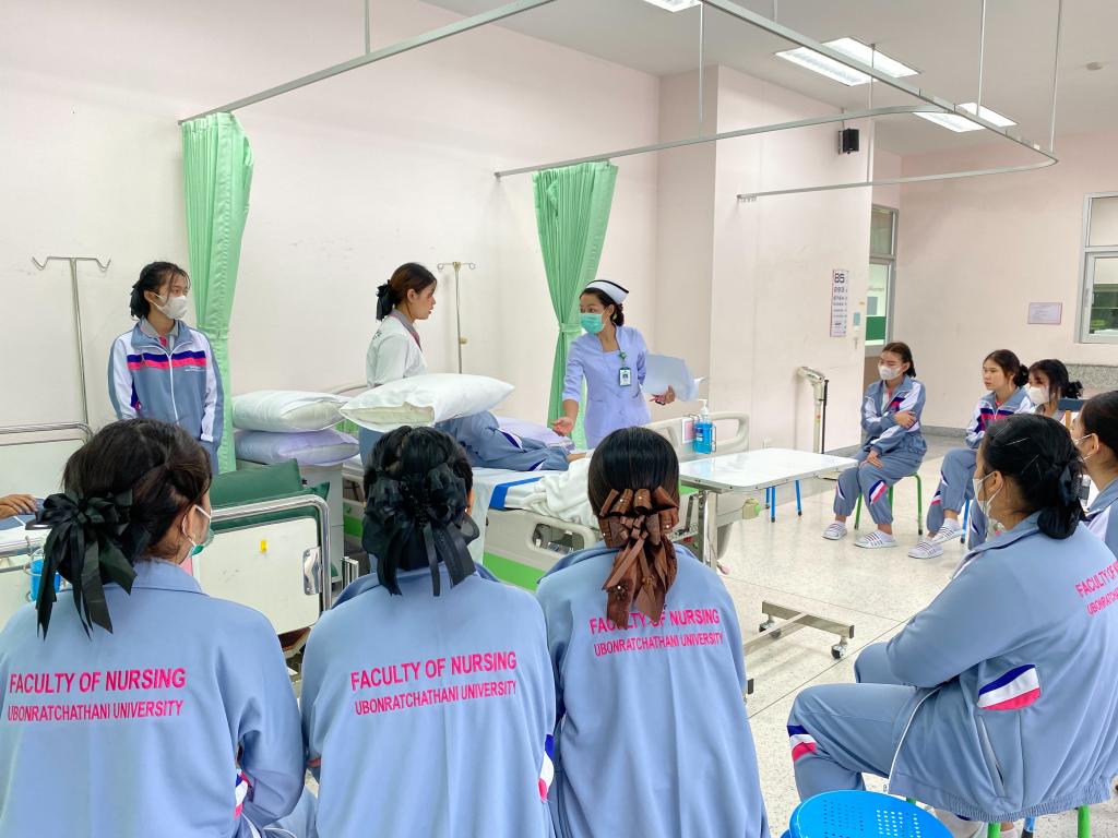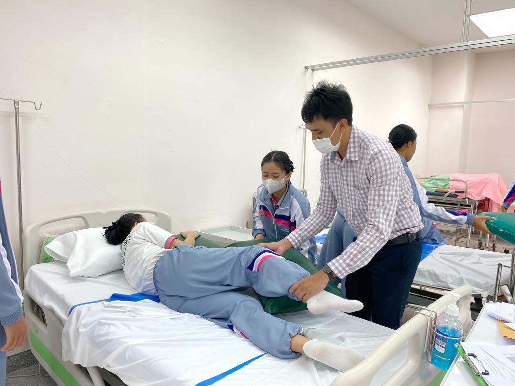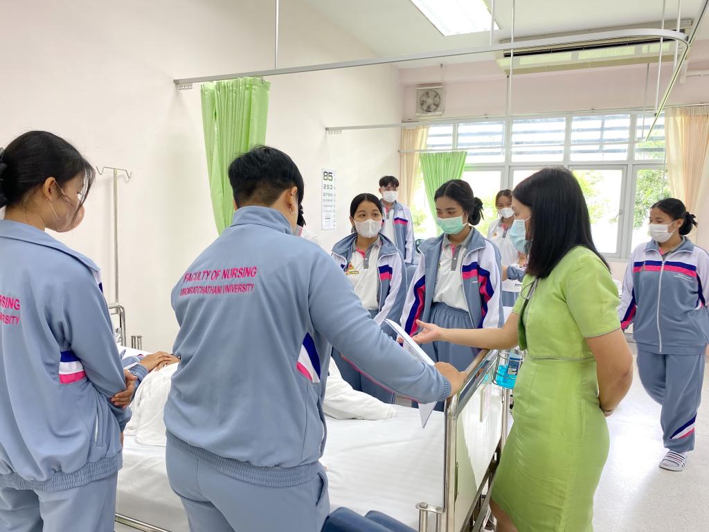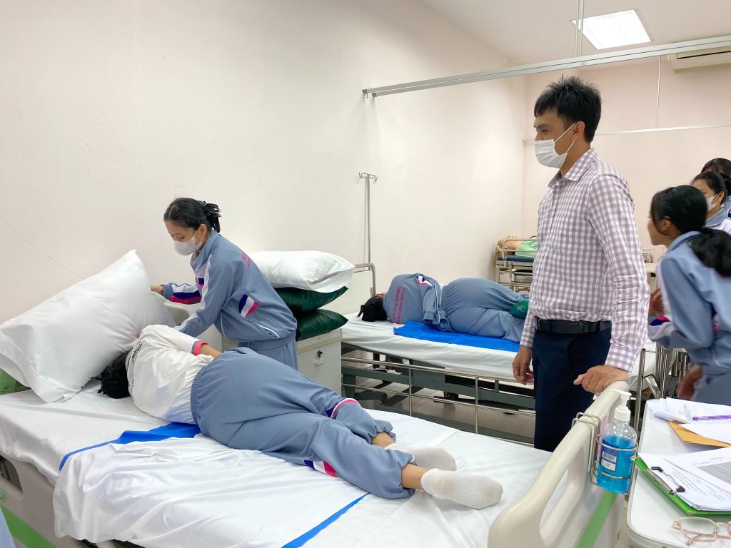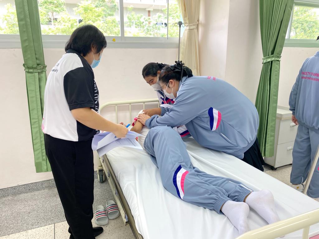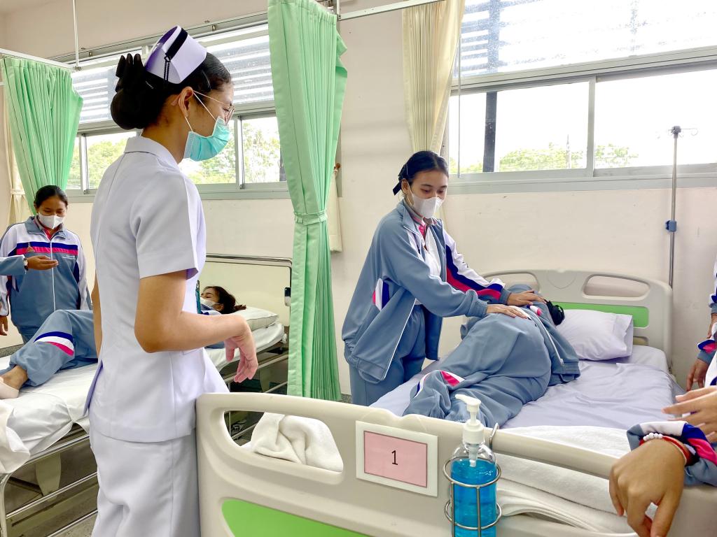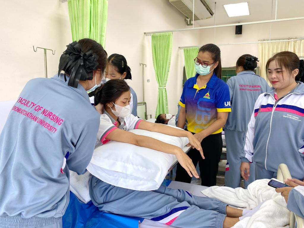 นักศึกษาหลักสูตรประกาศนียบัตรผู้ช่วยพยาบาล รุ่นที่ 8 ฝึกปฏิบัติการช่วยเหลือดูแล หัวข้อ การจัดท่าตรวจ/ยก เคลื่อนย้าย บริหารข้อและกล้ามเนื้อ ในรายวิชาเทคนิคการช่วยเหลือดูแลบุคคลขั้นพื้นฐาน ประจำภาคการศึกษา 1/2566