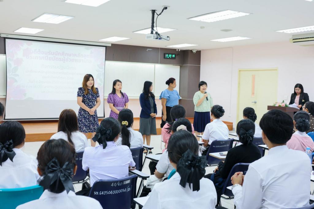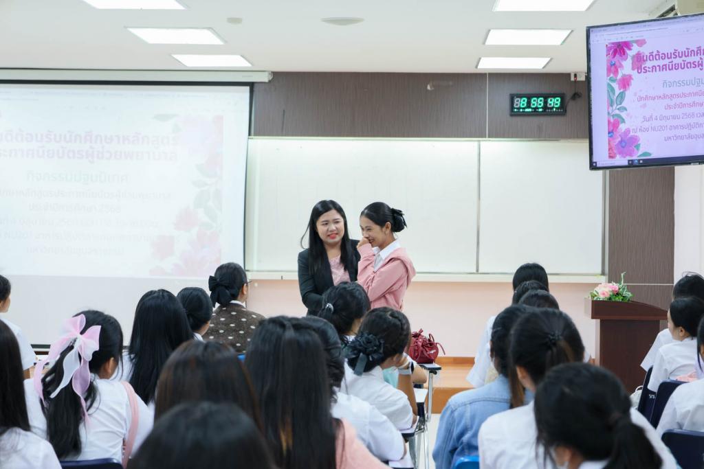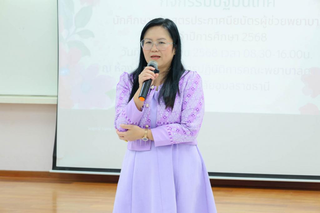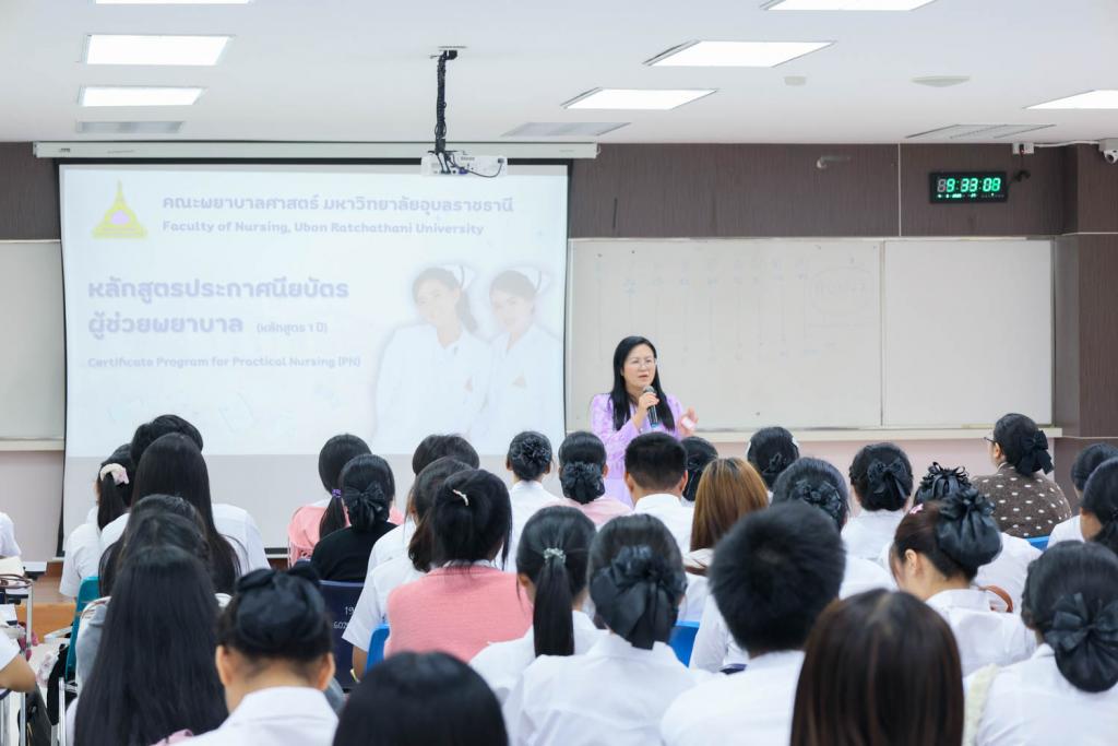 คณะพยาบาลศาสตร์ มหาวิทยาลัยอุบลราชธานี จัดกิจกรรมปฐมนิเทศนักศึกษาใหม่ หลักสูตรประกาศนียบัตรผู้ช่วยพยาบาล (รุ่นที่ 10) ประจำปีการศึกษา 2568 ณ ห้อง 201 อาคารคณะพยาบาลศาสตร์ โดยมีผู้ช่วยศาสตราจารย์ธมกร เธียรภูริเดช รองคณบดีฝ่ายวิชาการ ผู้แทนคณบดี ให้เกียรติกล่าวต้อนรับนักศึกษาอย่างอบอุ่น