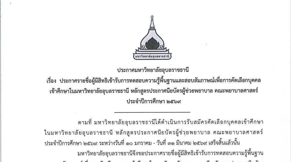 คลิ๊ก >> ประกาศรายชื่อผู้มีสิทธิสอบเข้ารับการทดสอบความรู้พื้นฐานและสอบสัมภาษณ์เข้าศึกษาในมหาวิทยาลัยอุบลราชธานีหลักสูตรประกาศนียบัตรผู้ช่วยพยาบาล คณะพยาบาลศาสตร์ ประจำปีการศึกษา 2569