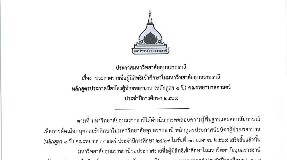ประกาศรายชื่อผู้มีสิทธิเข้าศึกษาหลักสูตรประกาศนียบัตรผู้ช่วยพยาบาล (หลักสูตร 1 ปี) ประจำปีการศึกษา 256924 เมษายน 2569