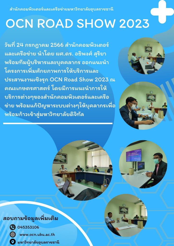 เมื่อวันที่ 24 กรกฎาคม 2566 สำนักคอมพิวเตอร์และเครือข่าย นำโดย ผศ.ดร. อธิพงศ์ สุริยา พร้อมทีมผู้บริหารและบุคคลากร ออกแนะนำโครงการเพิ่มศักยภาพการให้บริการและประสานงานเชิงรุก OCN Road Show 2023 ณ คณะเกษตรศาสตร์ โดยมีคณะผู้บริหารและบุคลากรให้การต้อนรับและร่วมกิจกรรม มีการแนะนำการให้บริการต่าง ๆ ของสำนักคอมพิวเตอร์และเครือข่าย พร้อมแก้ปัญหาระบบต่าง ๆ ให้บุคลากรเพื่อพร้อมก้าวเข้าสู่มหาวิทยาลัยดิจิทัล