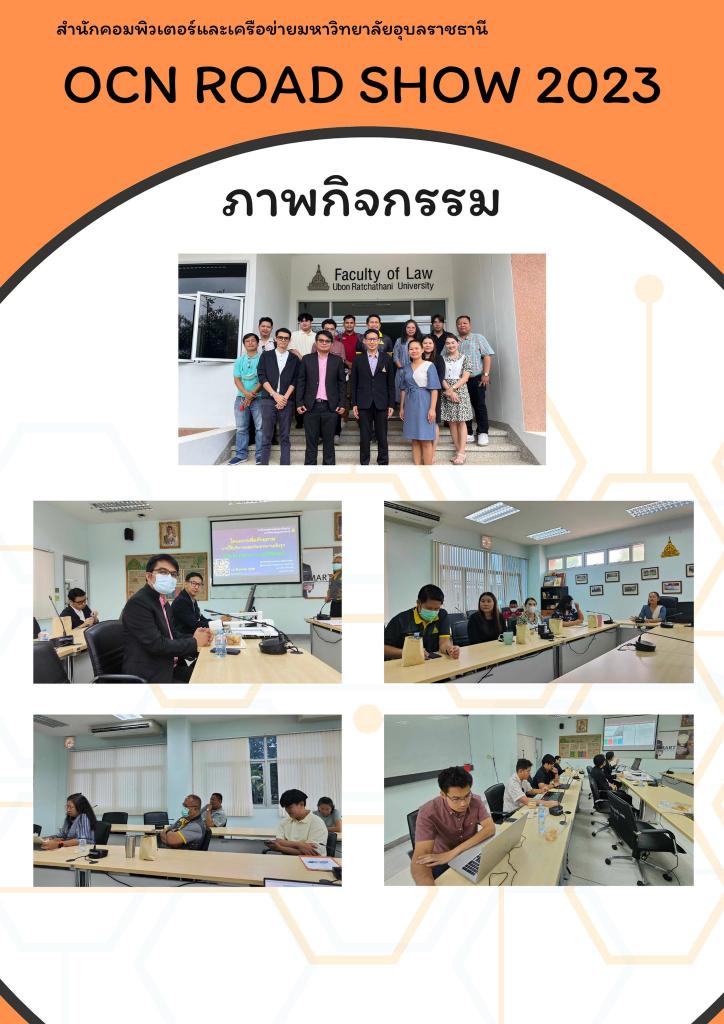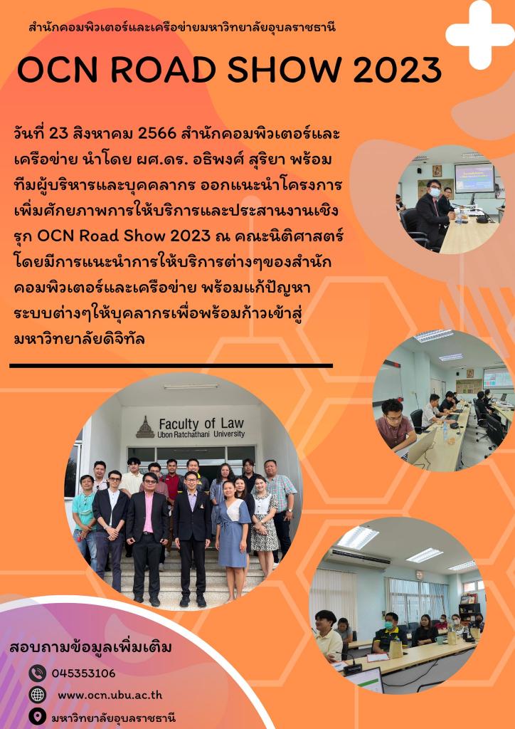 เมื่อวันที่ 23 สิงหาคม 2566 สำนักคอมพิวเตอร์และเครือข่าย นำโดย ผศ.ดร. อธิพงศ์ สุริยา ผู้อำนวยการสำนักคอมพิวเตอร์และเครือข่าย พร้อมทีมผู้บริหารและบุคคลากร ออกแนะนำโครงการเพิ่มศักยภาพการให้บริการและประสานงานเชิงรุก OCN Road Show 2023 ณ คณะวิศวกรรมศาสตร์ โดยมีคณะผู้บริหารและบุคลากรให้การต้อนรับและร่วมกิจกรรม มีการแนะนำการให้บริการต่าง ๆ ของสำนักคอมพิวเตอร์และเครือข่าย พร้อมแก้ปัญหาระบบต่าง ๆ ให้บุคลากรเพื่อพร้อมก้าวเข้าสู่มหาวิทยาลัยดิจิทัล