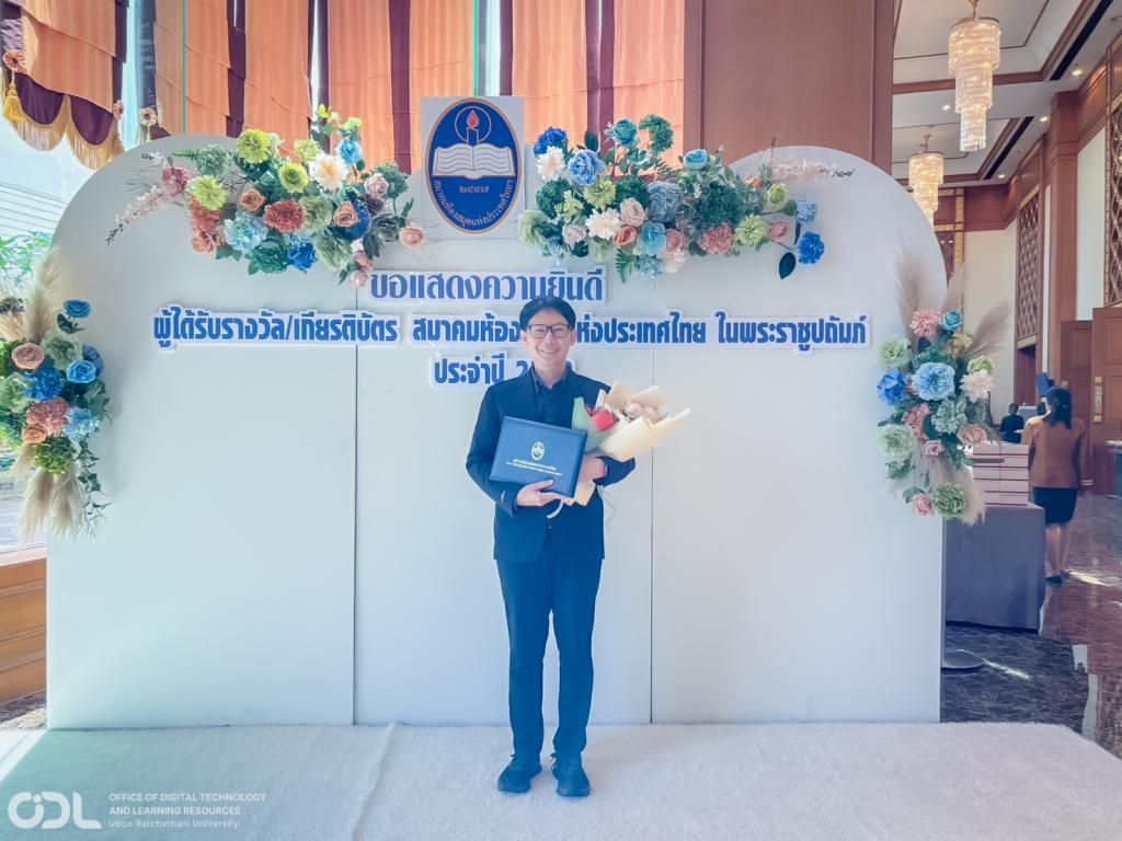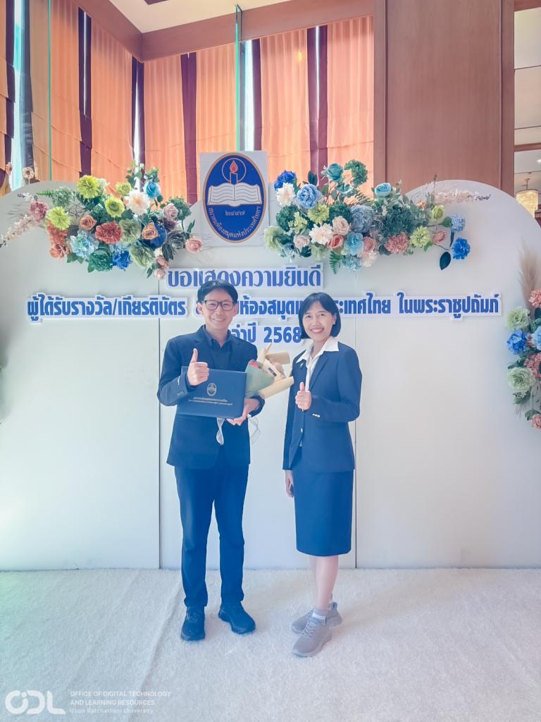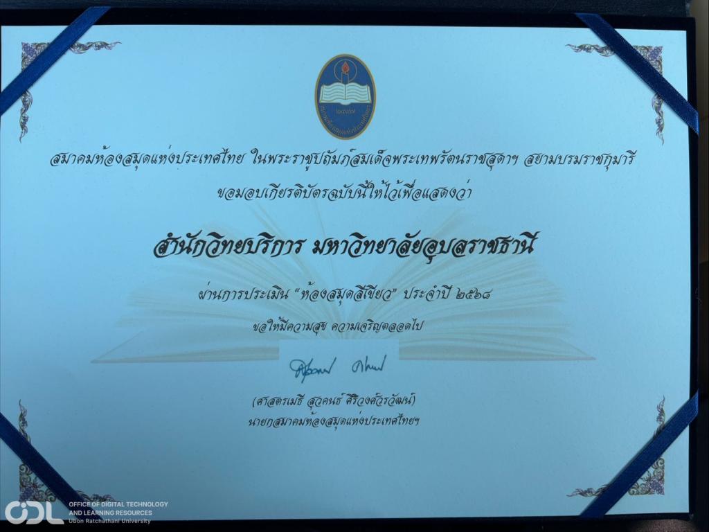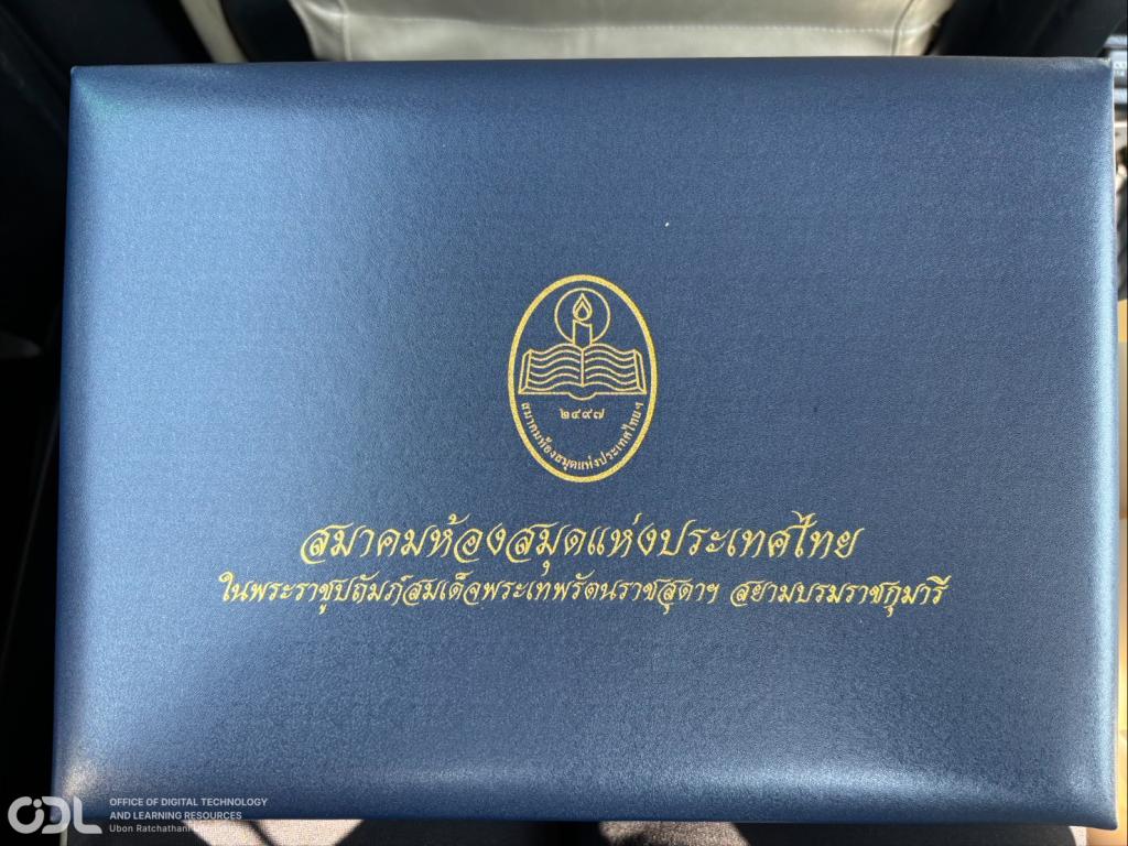 ผู้ช่วยศาสตราจารย์ ดร.อธิพงศ์ สุริยา รักษาการแทนผู้อำนวยการสำนักเทคโนโลยีดิจิทัลและทรัพยากรการเรียนรู้ (ODL) มหาวิทยาลัยอุบลราชธานี เป็นผู้แทนหน่วยงานเข้ารับเกียรติบัตร "ห้องสมุดสีเขียว" ประจำปี 2568 จากสมาคมห้องสมุดแห่งประเทศไทย ในพระบรมราชูปถัมภ์สมเด็จพระเทพรัตนราชสุดาฯ สยามบรมราชกุมารี ณ โรงแรมปรินซ์ พาเลซ กรุงเทพมหานคร