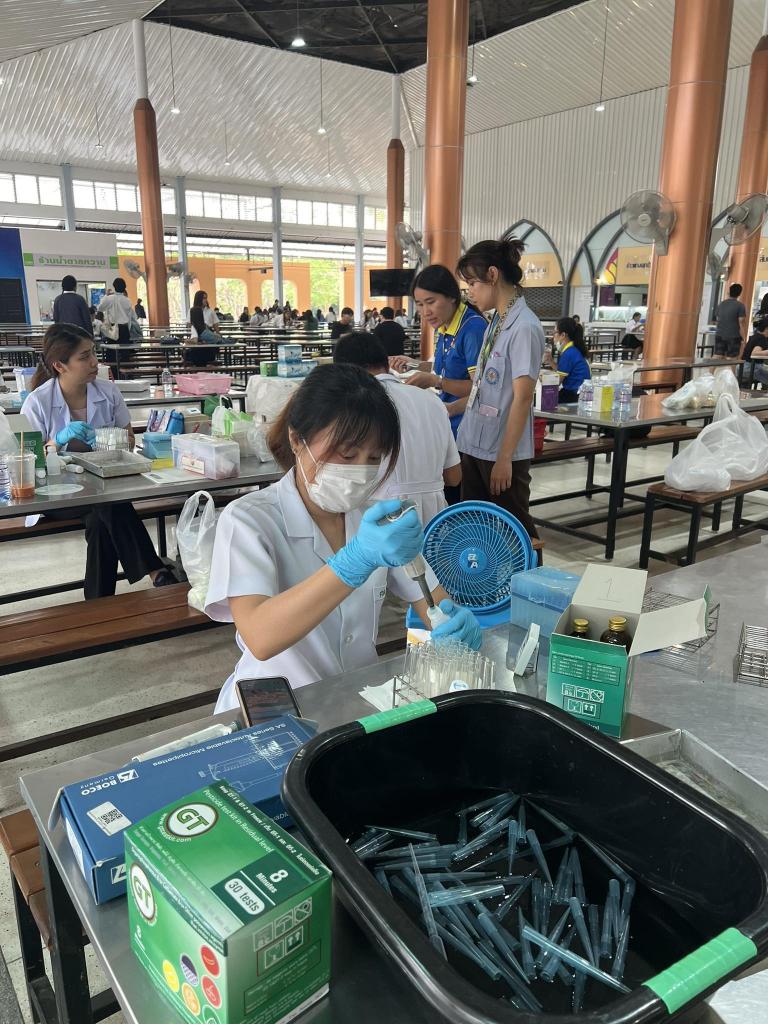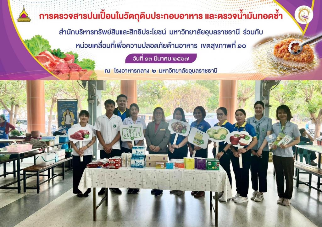 สำนักบริหารทรัพย์สินและสิทธิประโยชน์ มหาวิทยาลัยอุบลราชธานี ร่วมกับ หน่วยเคลื่อนที่เพื่อความปลอดภัยด้านอาหาร เขตสุขภาพที่ 10 จัดโครงการตรวจสารปนเปื้อนในวัตถุดิบประกอบอาหาร โคลิฟอร์มในน้ำและน้ำแข็ง และตรวจน้ำมันทอดซ้ำ ประจำปี 2567 โดยสุ่มเก็บตัวอย่างวัตถุดิบผัก ผลไม้ เนื้อสัตว์ และน้ำแข็งที่ผู้ประกอบการด้านอาหาร อาหารว่างและเครื่องดื่มภายในมหาวิทยาลัย นำมาประกอบอาหารจำหน่าย เพื่อนำมาตรวจสารตกค้างยาฆ่าแมลงในผัก ผลไม้สด และตรวจวิเคราะห์สารปนเปื้อนในอาหาร (บอแรกซ์ ฟอร์มาลดีไฮด์ กรดซาลิซิลิค ไฮโดรซัลไฟต์และสารเร่งเนื้อแดง) สุ่มตรวจโคลิฟอร์มในน้ำแข็ง และสุ่มตรวจน้ำมันทอดซ้ำของร้านอาหารภายในมหาวิทยาลัยอุบลราชธานี เพื่อเฝ้าระวังความปลอดภัยของการใช้น้ำมันทอดอาหาร พร้อมทั้งให้ความรู้แก่ผู้ประกอบการเกี่ยวกับอันตรายจากการใช้น้ำมันทอดซ้ำ ซึ่งจะเป็นการสร้างความมั่นใจให้กับผู้มาใช้บริการ โดยมี นางสาวมนัสดาชัยสวนียากรณ์ รองผู้อำนวยการสำนักบริหารทรัพย์สินและสิทธิประโยชน์ ให้การต้อนรับ ณ โรงอาหารกลาง 2 มหาวิทยาลัยอุบลราชธานี ในวันพุธที่ 13 มีนาคม 2567