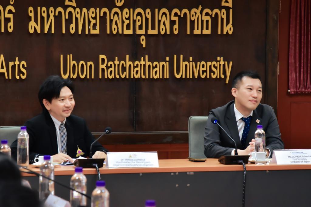 On February 16, 2024, Dr. Thitidaj Luetrakul, Vice President for Planning and Organizational Quality Development along with Assistant Professor Dr. Oranuch Puangsuk, Assistant to the President for International Relations and Education, and Associate Professor Dr. Surasak Khamkhong, Dean of the Faculty of Liberal Arts extended a warm welcome to Mr. UCHIDA Takeshi, the Secretary of the Embassy of Japan in Thailand, and representatives from esteemed Japanese institutions. The reception took place at the Faculty of Liberal Arts, Ubon Ratchathani University.