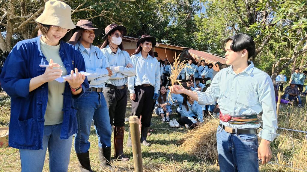On November 30, 2024, the Faculty of Agriculture at Ubon Ratchathani University (UBU) hosted the annual project named "Mue Riaw Ro Kiew Ruang 2024" ("harvesting rice by hand"). The event was held at the faculty’s agricultural plot and more than 300 students and staff participated in the activity. Dr. Narintorn Boonbrahm, the Dean of the Faculty of Agriculture, presided over the opening ceremony. The harvested rice will be kept for the graduates' homecoming, the graduation ceremony in 2023, and to support various student activities.