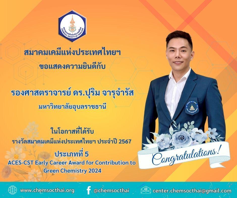 He is widely recognized for his outstanding contributions to research and education, both nationally and internationally. His numerous accolades include being selected by the Chemical Society of Thailand for the ACES-CST Early Career Award for Contributions to Green Chemistry 2024. He will receive this prestigious award from Her Royal Highness Princess Chulabhorn Krom Phra Srisavangavadhana at the Pure and Applied Chemistry International Conference 2025 (PACCON 2025), which will be held at the Khao Yai Convention Center, Nakhon Ratchasima, from February 13–15, 2025.