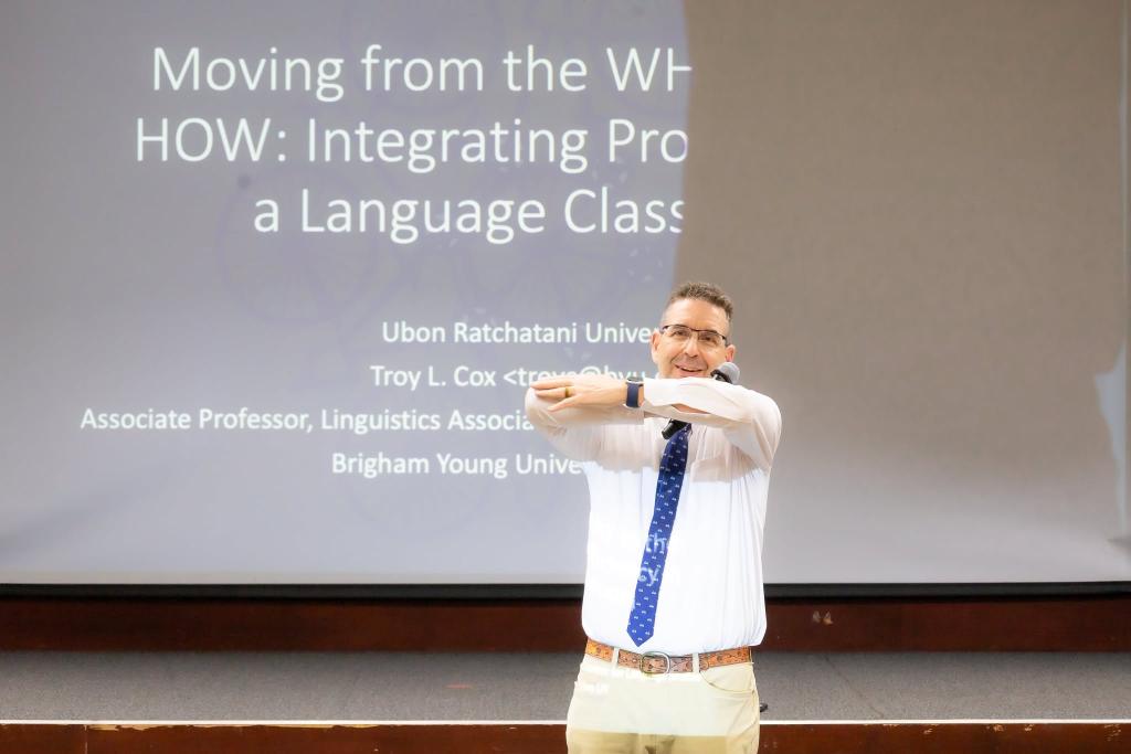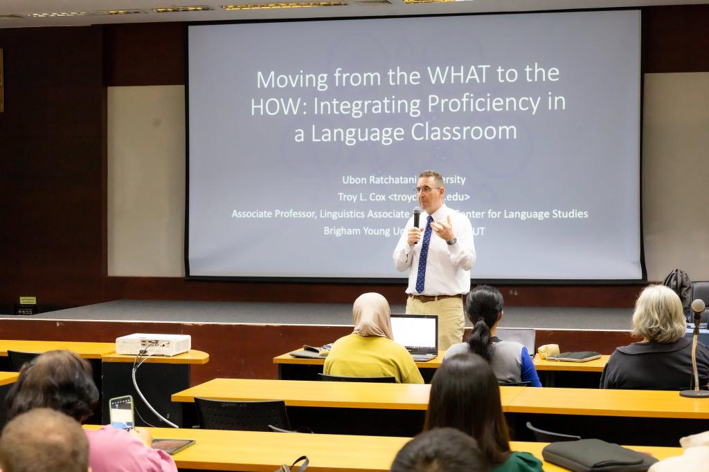 In the afternoon, Dr. Cox served as the keynote speaker at a professional development workshop entitled “Moving from the WHAT to the HOW: Integrating Proficiency in a Language Classroom.” The event was held from 1:00–4:00 p.m. at Sri Mueang Mai Meeting Room, Office of the President Building 2, UBU.