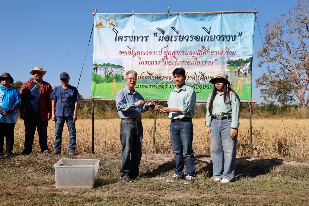 On 30 November 2025, the Faculty of Agriculture at Ubon Ratchathani University organized the second phase of the “Mue Riew Ro Kiao Ruang” Project (Harvesting Phase) at the faculty’s rice field. The activity aims to preserve the traditional cultural practice of collective rice harvesting (long khaek kiao khao), while providing hands-on learning about agricultural processes and donating harvested rice to support flood-affected communities in southern Thailand during the recovery period.