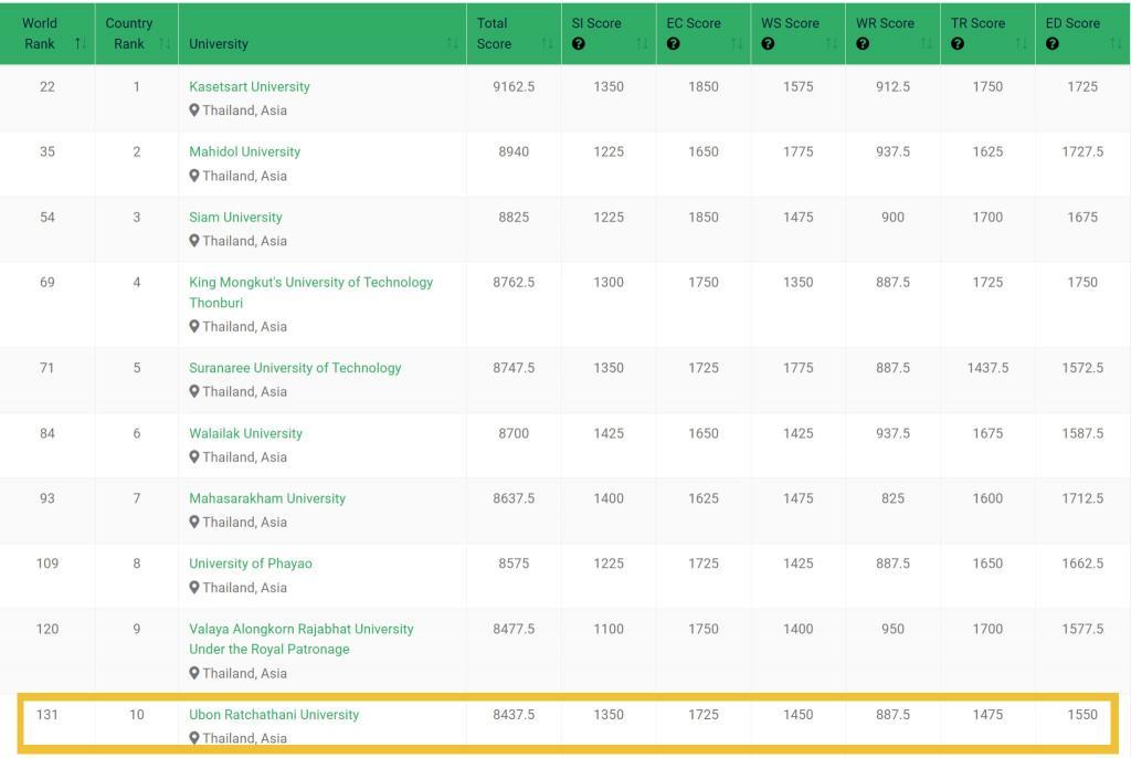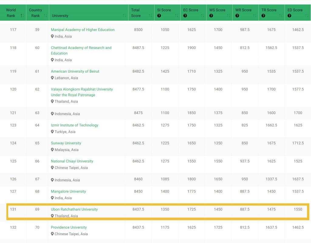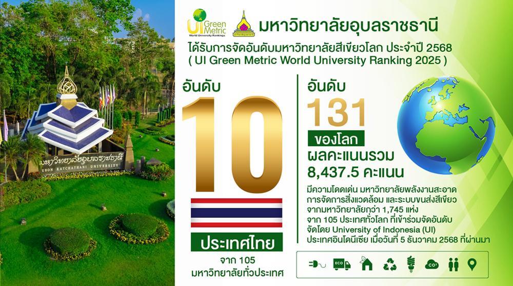 Ubon Ratchathani University (UBU) has been ranked 10th nationally and 131st worldwide in the UI GreenMetric World University Ranking 2025, with a total score of 8,437.5 points. The ranking evaluated 1,745 universities from 105 countries worldwide and was organized by the University of Indonesia (UI). The results were officially announced on 5 December 2025. UBU demonstrated notable strengths in clean energy initiatives, environmental management, and green transportation systems.