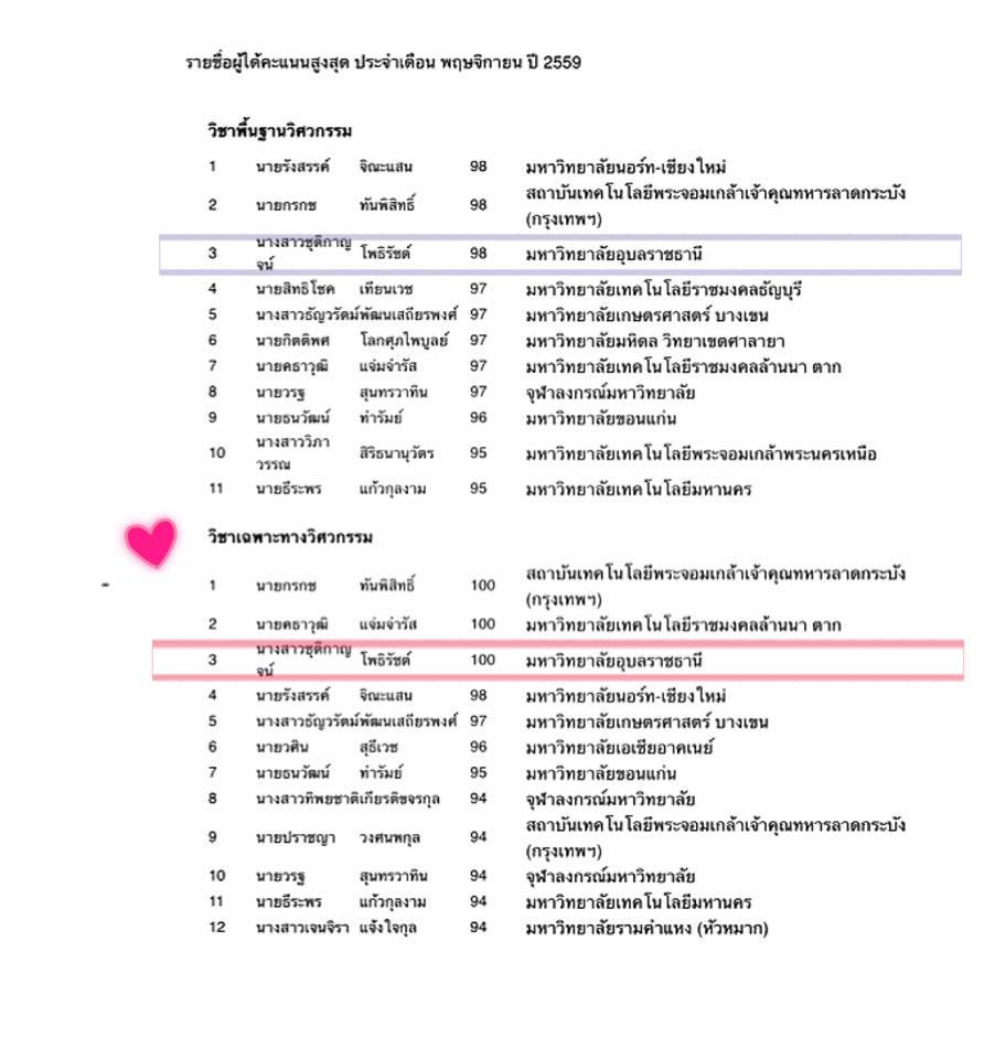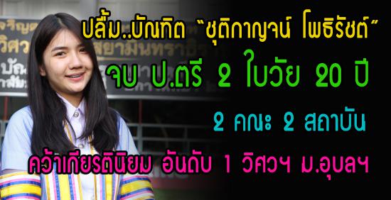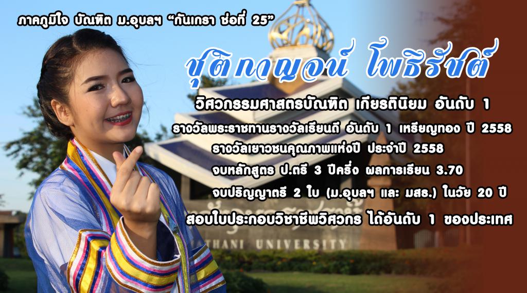 อีกหนึ่งความภาคภูมิใจบัณฑิตแห่ง มหาวิทยาลัยอุบลราชธานี โดย นางสาวชุติกาญจน์ โพธิรัชต์ บัณฑิตคณะวิศวกรรมศาสตร์ “กันเกรา ช่อที่ 25”ที่มีความโดดเด่นในสาขาวิชาวิศวกรรมศาสตร์ ดีกรีนักศึกษารางวัลพระราชทานเรียนดี อันดับ 1เหรียญทอง ประจำปี 2558 รางวัลเยาวชนคุณภาพแห่งปี ประจำปี 2558จบหลักสูตร ป.ตรี ม.อุบลฯ 3ปีครึ่ง พร้อมด้วยเกียรตินิยม อันดับ 1 พ่วงด้วยปริญญาบัตรอีกหนึ่งใบ จาก มหาวิทยาลัยสุโขทัยธรรมาธิราช ในวัยเพียง 20ปี ล่าสุดเข้ารับการสอบใบประกอบวิชาชีพวิศวกร ประจำเดือนพฤศจิกายน ซึ่งได้คะแนนสูงสุด อันดับ 1 ของประเทศ พร้อมเข้ารับพระราชทานปริญญาบัตร ปีการศึกษา 2558 มหาวิทยาลัยอุบลราชธานี อย่างภาคภูมิใจ ในวันอังคารที่ 13 ธันวาคม 2559